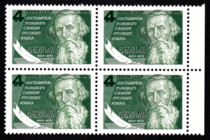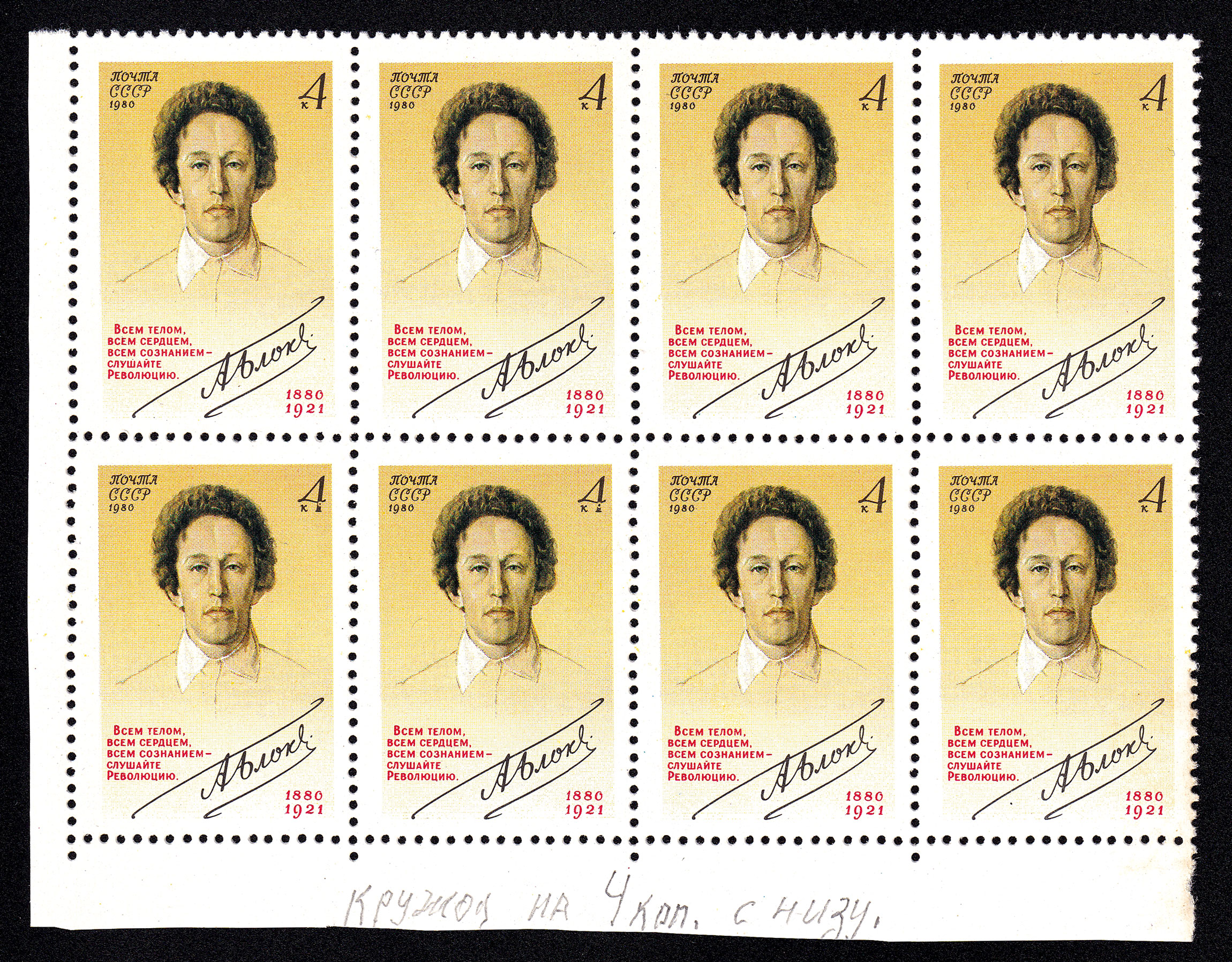 Кат. № 4584Ka, 4584. Квартблок. Две правые марки 4584Ка: "пятно" на правом глазу. Тираж – 3600 000. Печать: металлография в сочетании с глубокой. Перфорация рамочная 11 1/2.