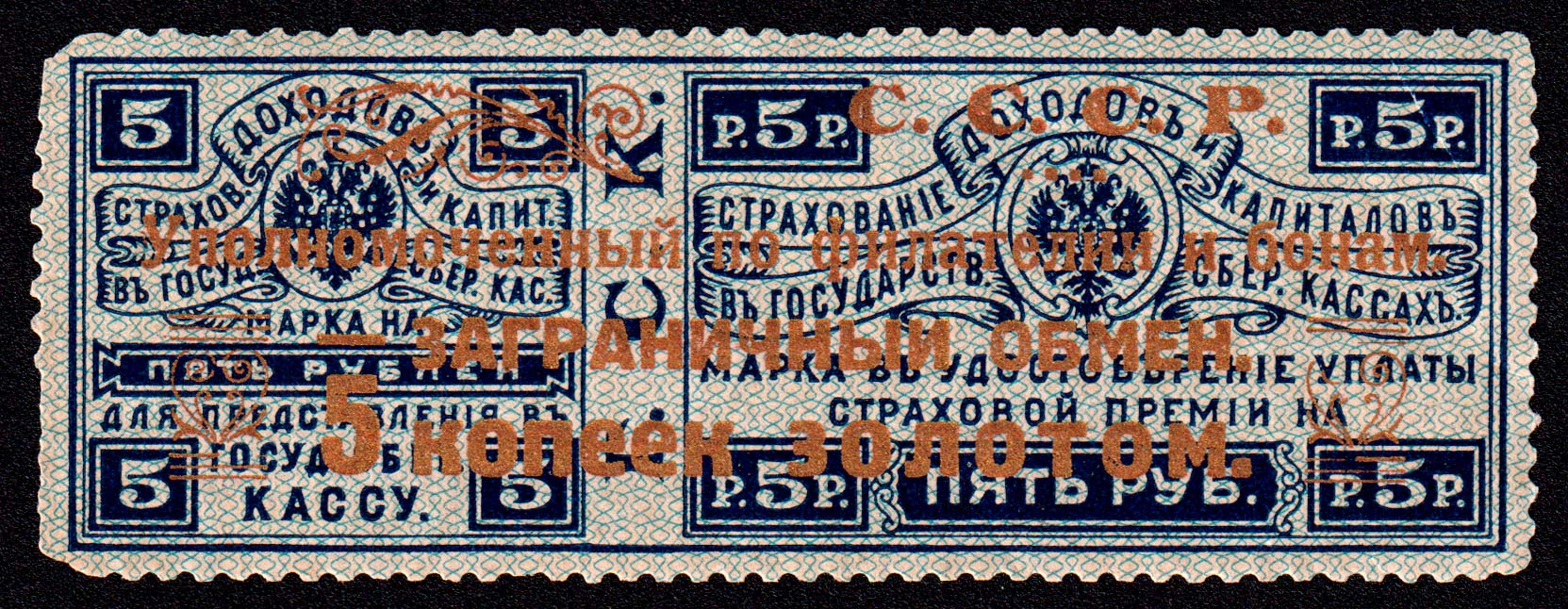 Кат. № PE4I. Надпечатка золотая типогр. "С.С.С.Р. Уполномоченный по филателии и бонам. заграничный обмен. 5 копеек золотом." на марке страхового сбора Российской Империи. Тип I – все точки круглые. Перфорация линейная 13 1/2.