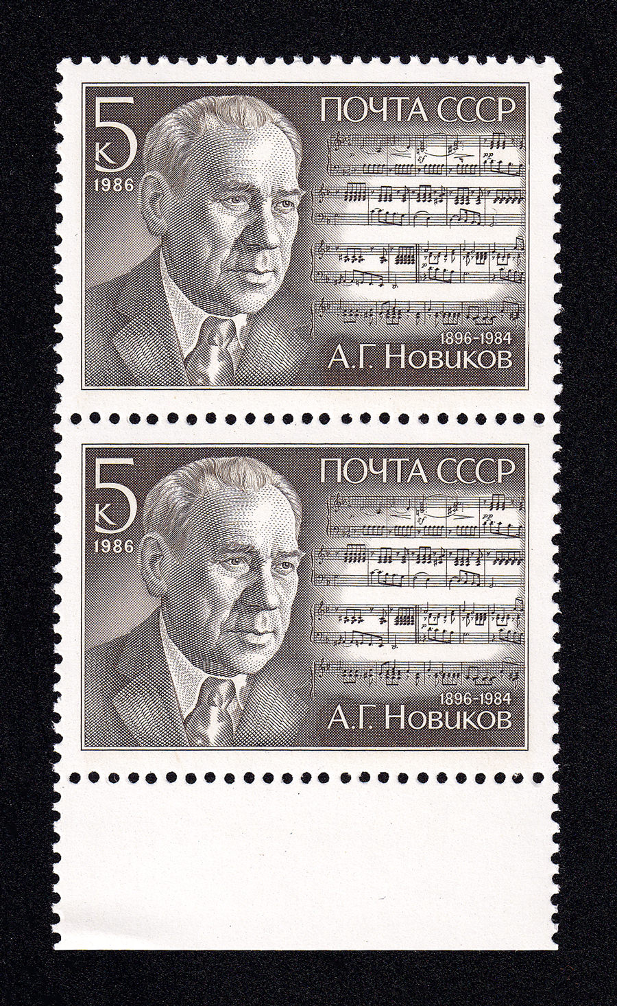 Кат. № 5707. Пара марок. На верхней марке лишняя "нота" в верхнем правом углу. Тираж – 2800 000. Печать: металлография. Перфорация гребенчатая 12 1/2 : 12.