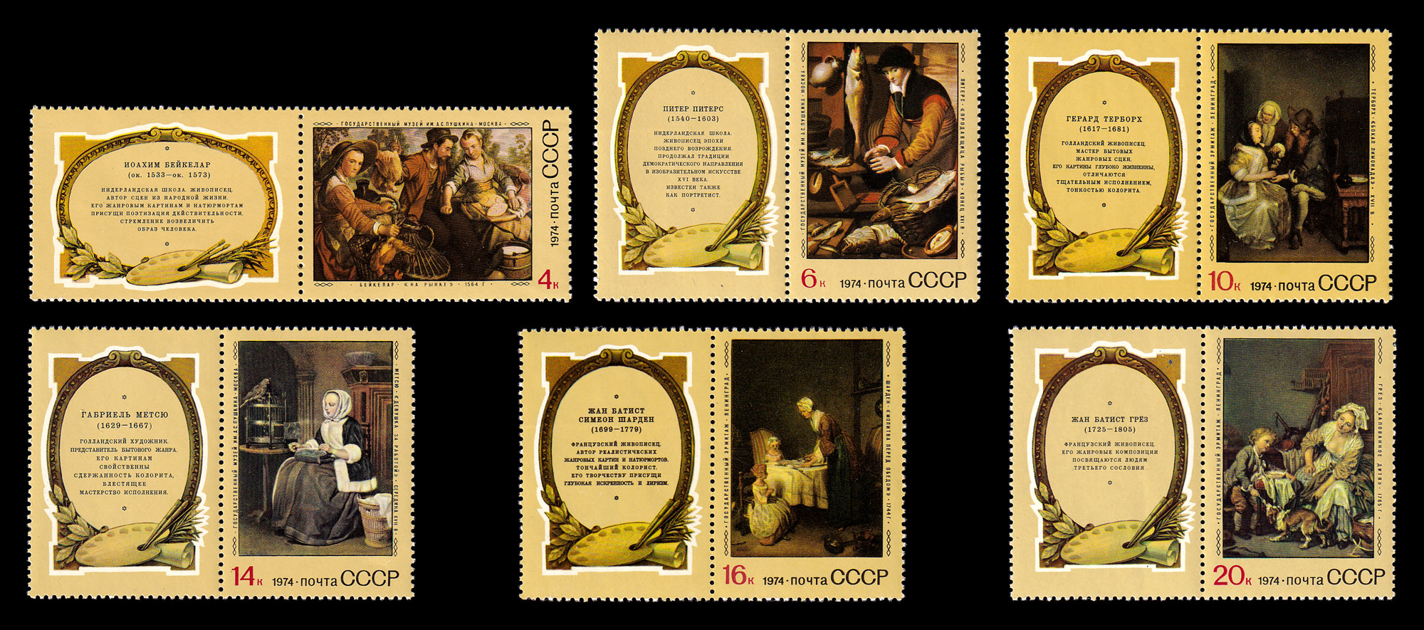 1) Иоахим Бейкелар. «На рынке». 4 к. Кат. № 4356. Тираж – 6 700 000. Перфорация гребенчатая 12 1/2 : 12.