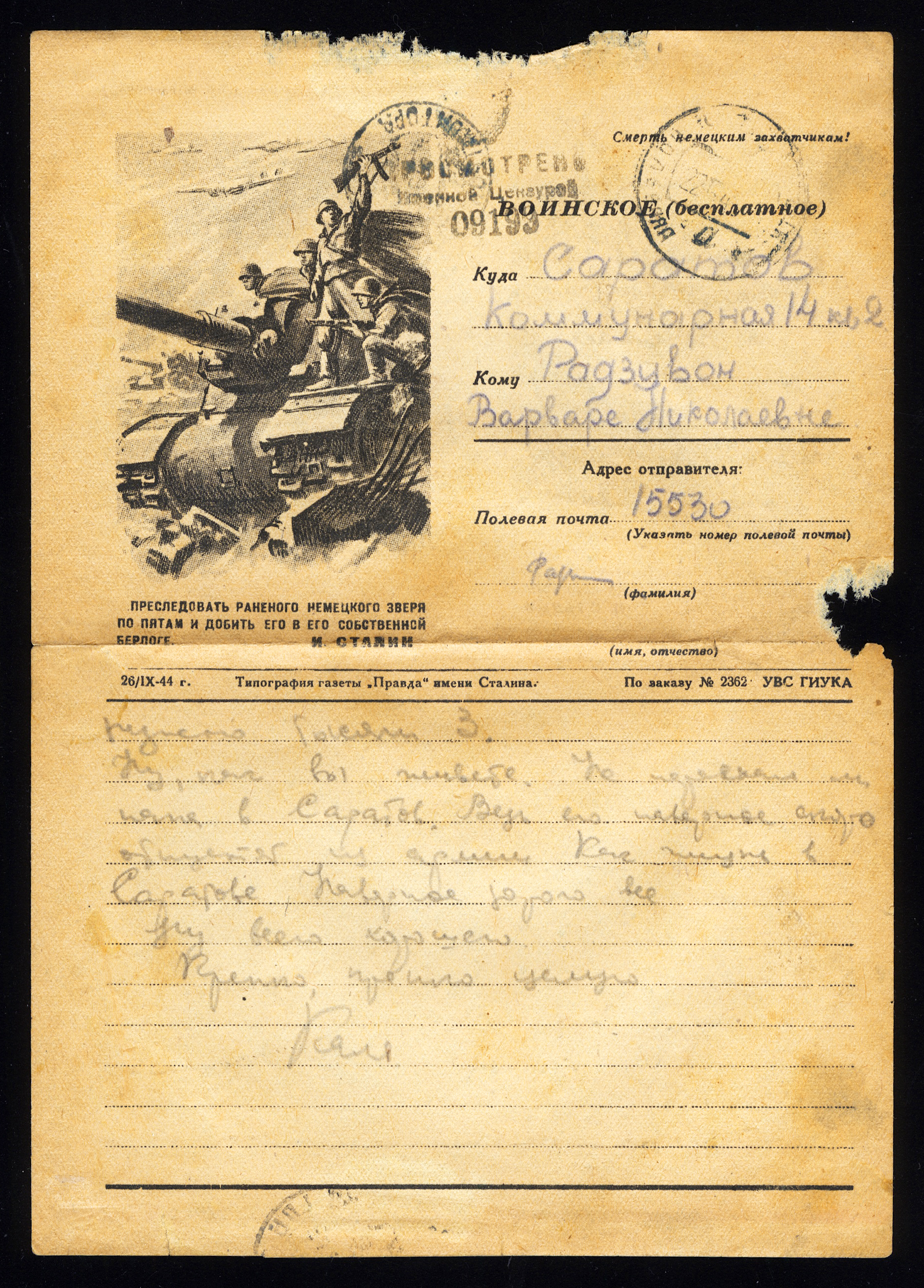 1941-1945. СССР. Закрытое письмо. "Преследовать раненого немецкого зверя".