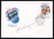 Автограф Юрия Малышева на конверте, приуроченному ко дню запуска пилотируемого космического корабля "Союз Т-2", 1980г.