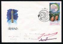 Автографы художника Германа Комлева и космонавта Владимира Джанибекова на конверте, приуроченному ко дню запуска пилотируемого космического корабля "Союз Т-4", 1981г.
