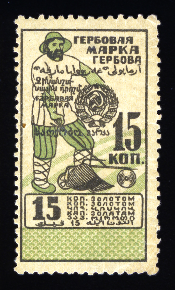 Кат. № 23 (4.1). Сцепка. Печать: типографская. Бумага белая. Wmk 11b. Перфорация гребенчатая 12 : 12 1/2. Размер рисунка: "рабочий" — 21 х 39,5, "крестьянин" — 21 х 38,7 мм.