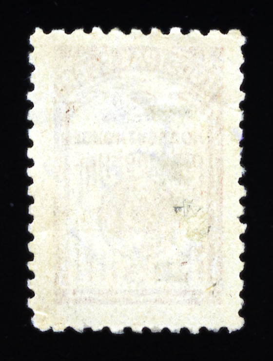 Первый выпуск адресного сбора. 3 раряд. Тип. 2 — открытая четверка. Печать: типографская. Бумага тонкая, Owm, коричневый фон состоящий из точек. Размер рисунка 23х52