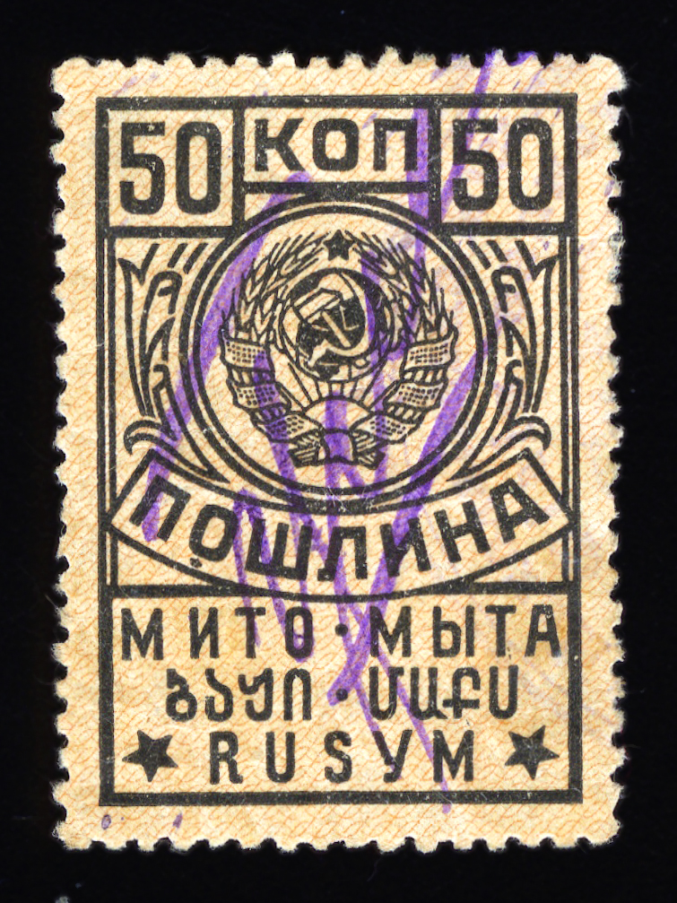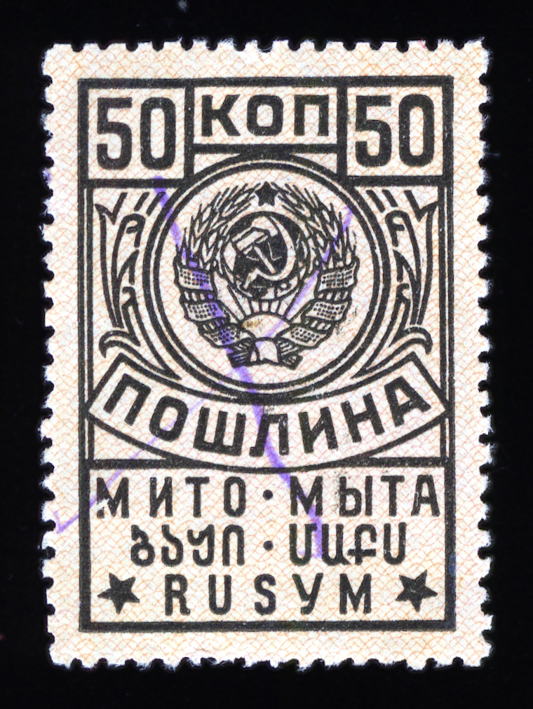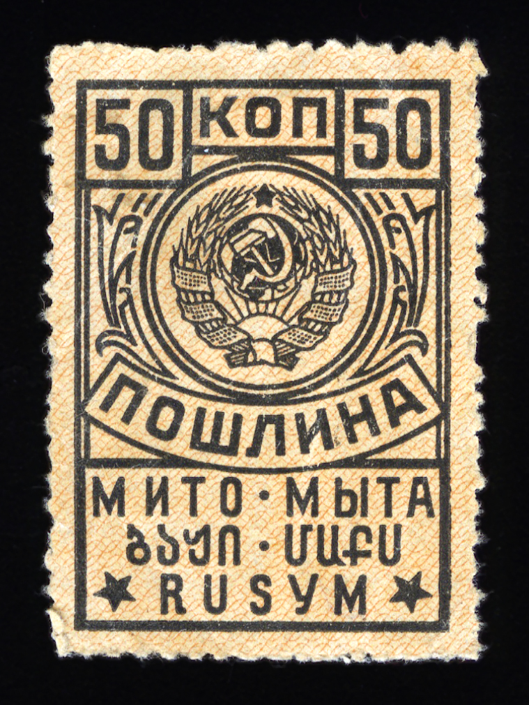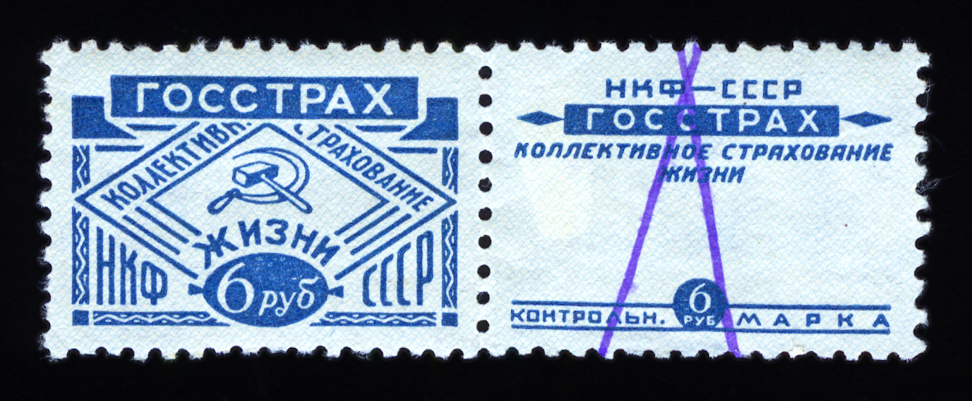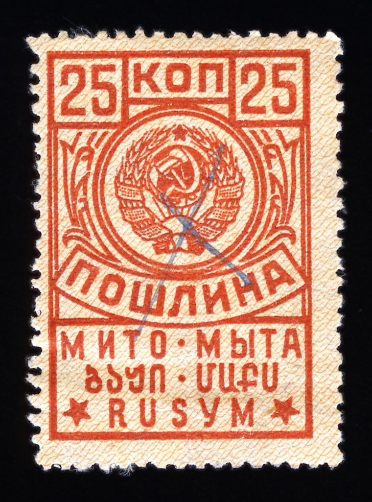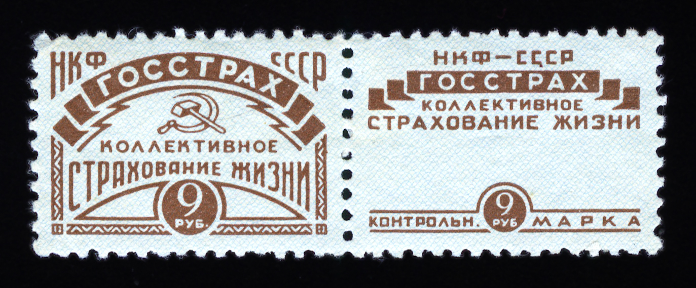 Кат. № 25 (4.12.1). С купоном. Печать: типографская. Бумага белая. Фон из горизонтальных волнистых линий. Перфорация 12 : 12 1/2. Размер рисунка талона с маркой 48,5 х 15 мм (23,5 x 15 мм каждая часть).