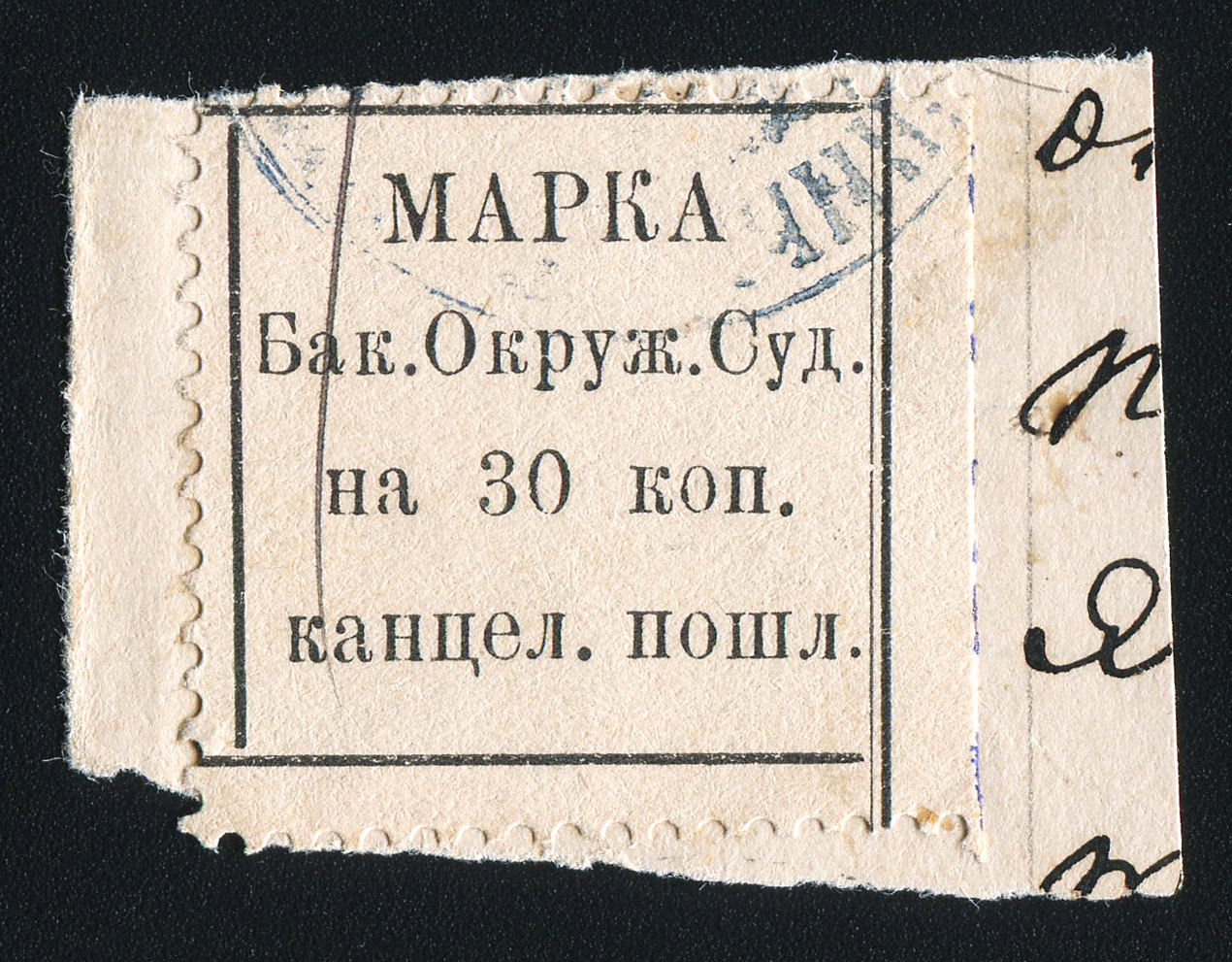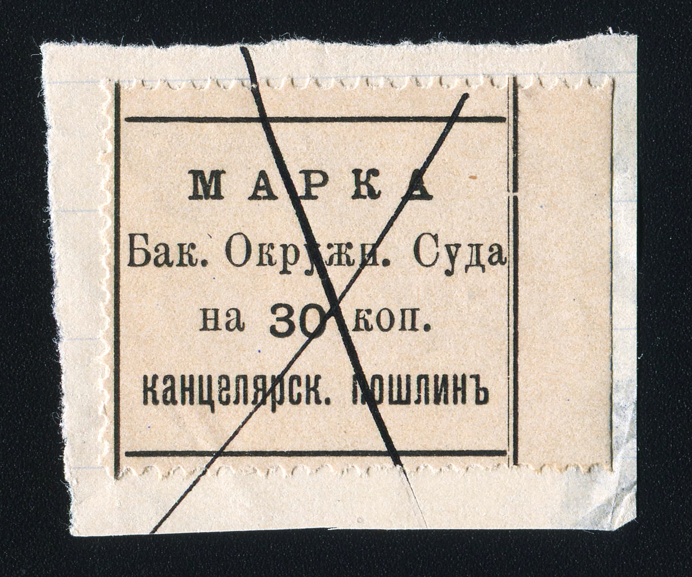1890. Баку. Канцелярская пошлина. 30 коп. Текст в 5 строк: "Марка (Квитанция) Бакин. Окр. Суда 30 коп. канц. пошл.".