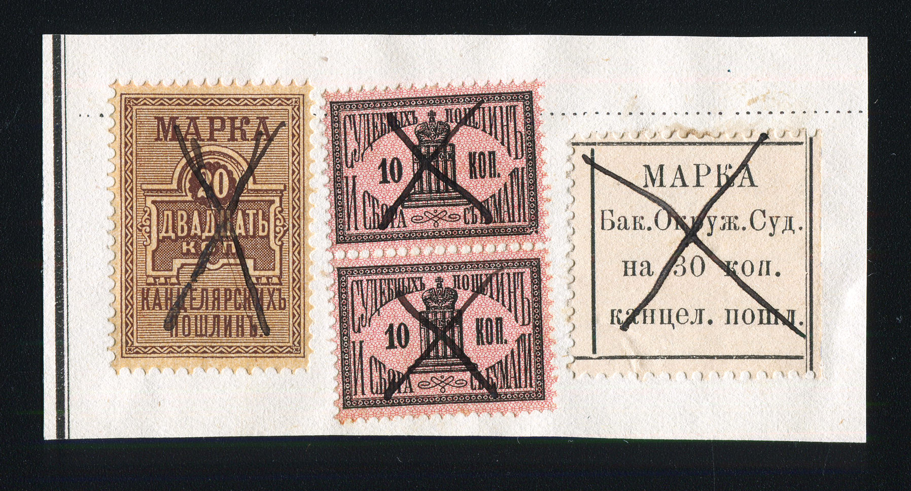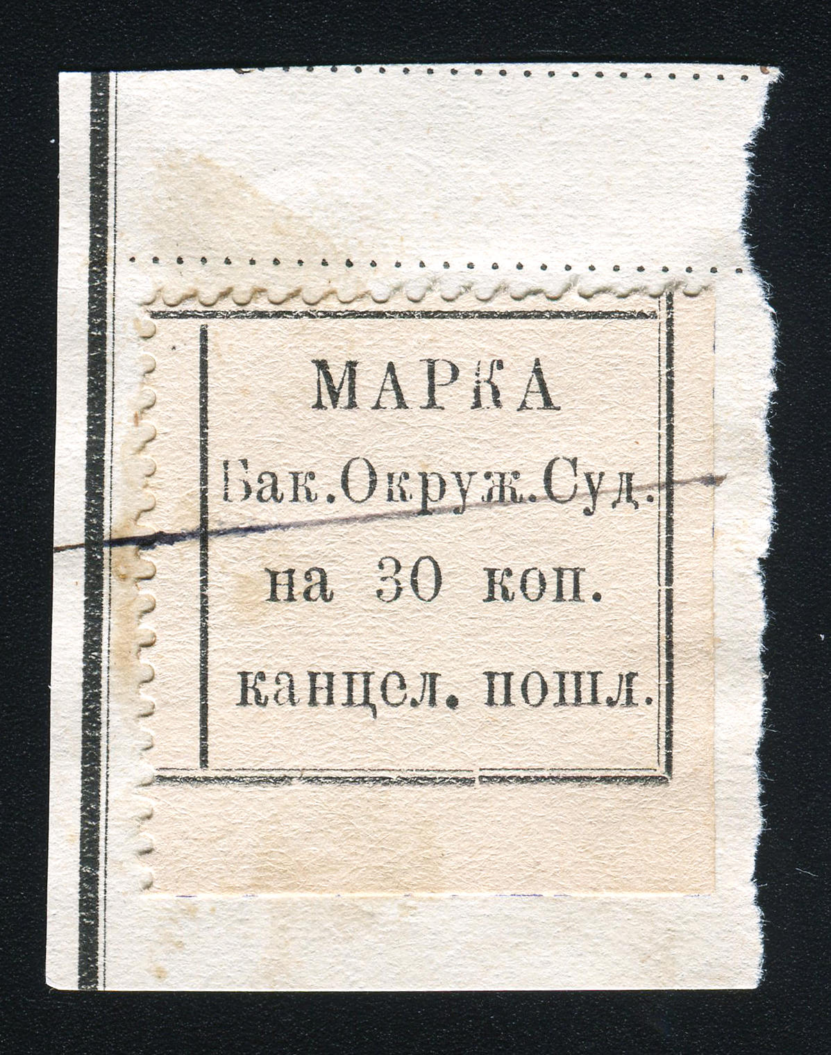 1897. Баку. Канцелярская пошлина. 30 коп. Текст в 4 строки: "Марка (Квитанция) Бак. Окружн. Суда на 30 коп. канцелярск. пошлинъ".