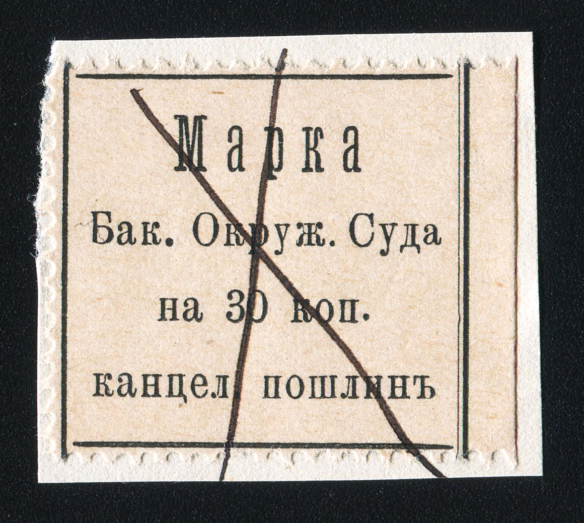 1893. Баку. Канцелярская пошлина. 30 коп. Текст в 4 строки: "Марка (Квитанция) Бак. Окруж. Суд. На 30 коп. канцел. (или "канцеляр." на квитанции) пошл.".