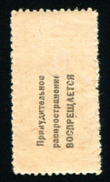 Красноармеец с винтовкой наперевес. Размер рамки 14,5 х 19 мм. Одноцветная литографская печать на сероватой (оттенки) бумаге. В прямоугольной декоративной рамке различные рисунки. Под рисунком текст в четыре строки: «Ц.Т.У. Всероссийского комитета помощи инвалидам». Сверху аббревиатура «РСФСР».