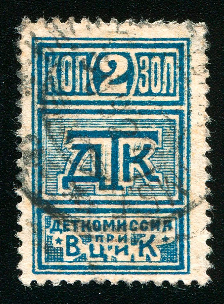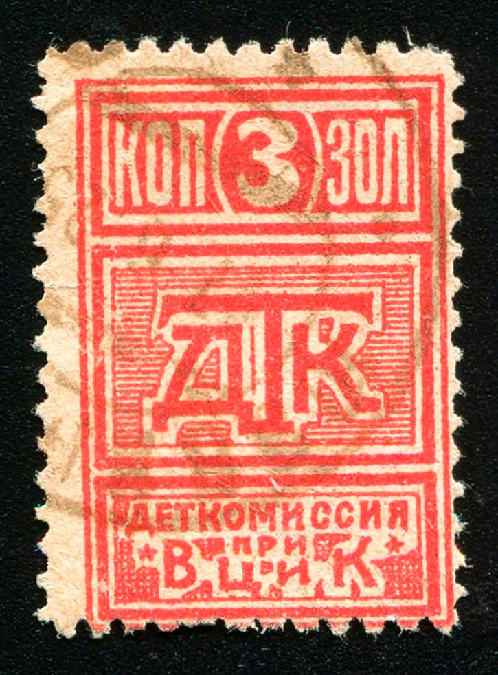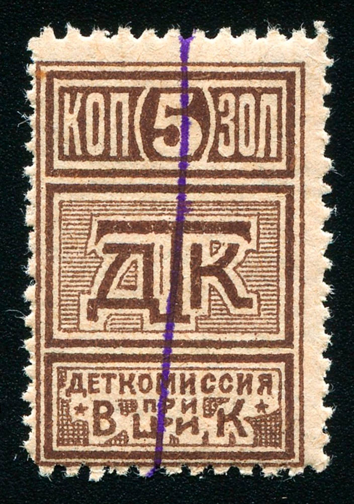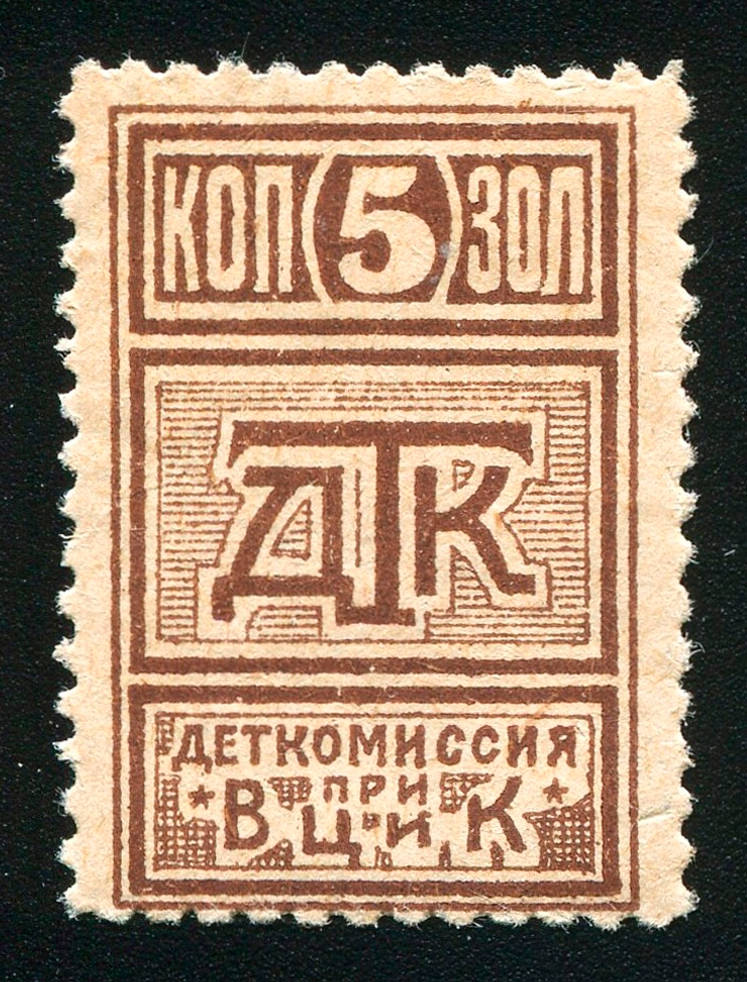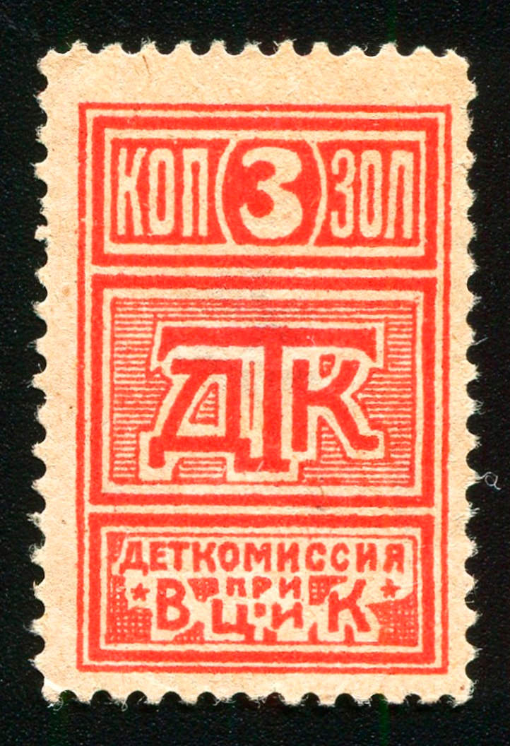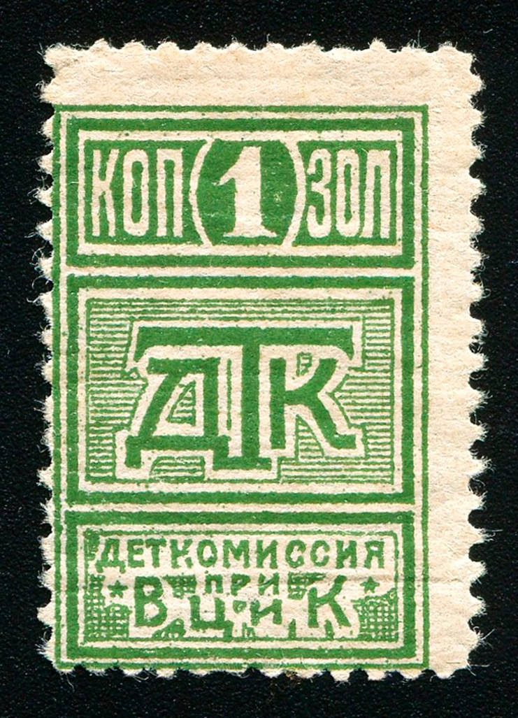 В центре в прямоугольной рамке аббревиатура «ДТК». Сверху в отдельной рамке номинал. Одноцветная печать на белой (оттенки) бумаге. Перфорация 11 1/2. С клеем. Внизу текст в две строки: «Деткомиссия при В.Ц.И.К.».