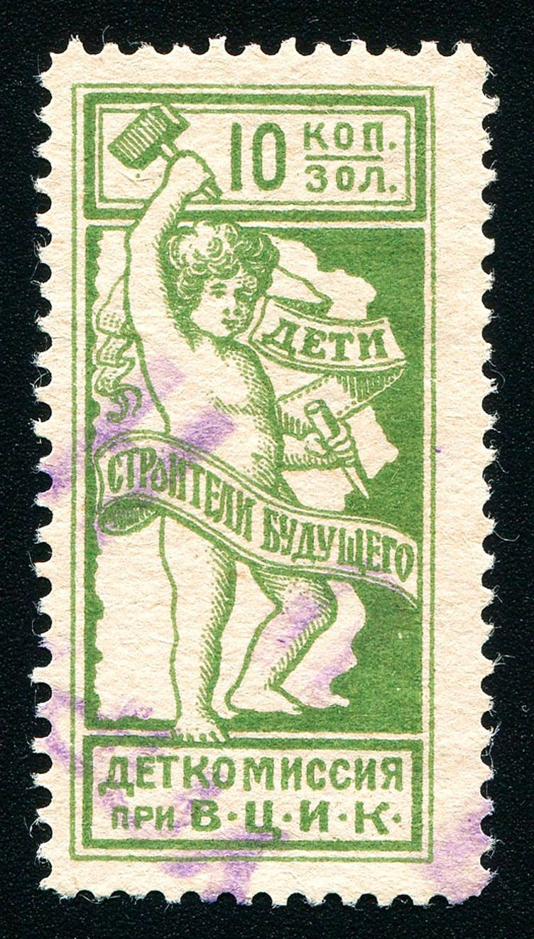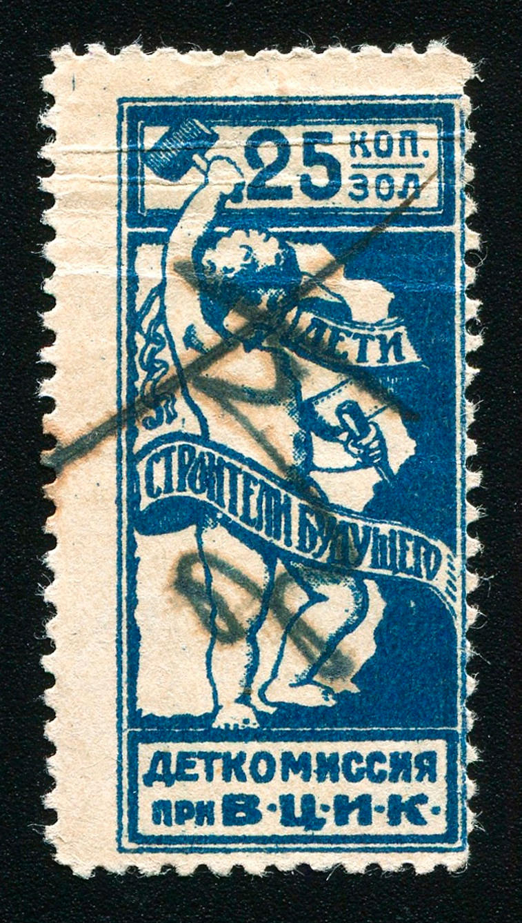 Марка в виде треугольника с Размер рамки 46 х 24 мм. Одноцветная печать на белой бумаге. Перфорация 10, 10 1/2, 12 1/2, 13 и их комбинации. С клеем. В центре в треугольной рамке текст в четыре строки: «Деткомиссия при ВЦИК. Благотворительная марка». Сверху номинал. По периметру рамки текст: «Принудительное распространение воспрещается и не подлежит приему и выдаче взамен дензнаков».