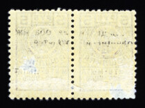 Кат. № 5 (3.3.5.1.1). Пара. Печать: литографская. Бумага рыхлая, сероватая. Желтый сетчатый фон. Без перфорации. С клеем и без клея. Размер 20,5 х 40 мм.