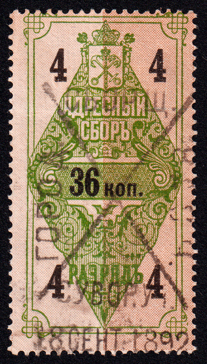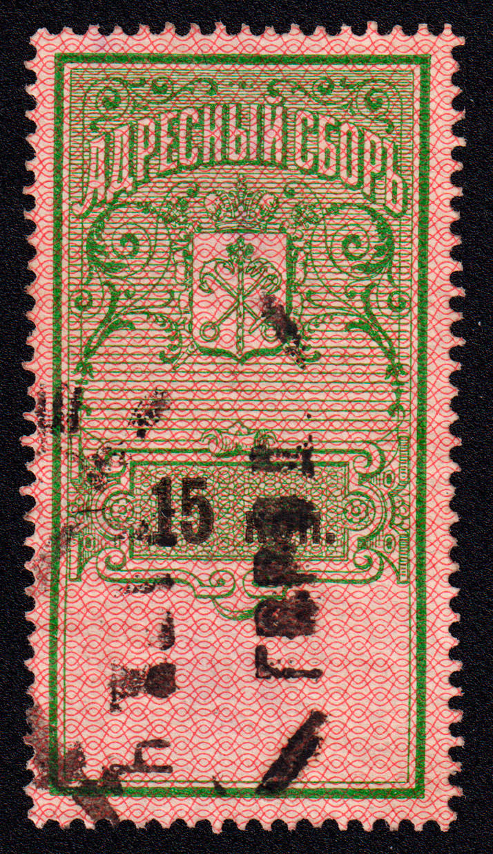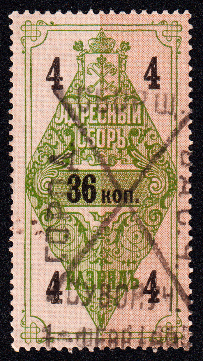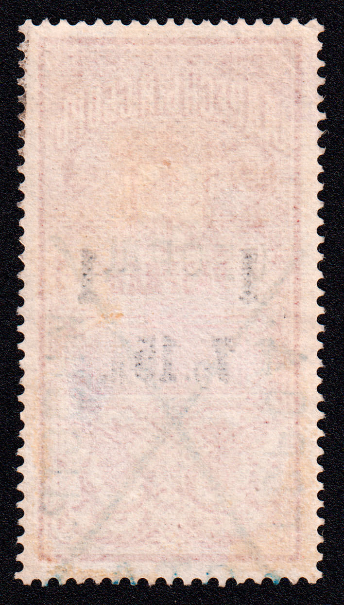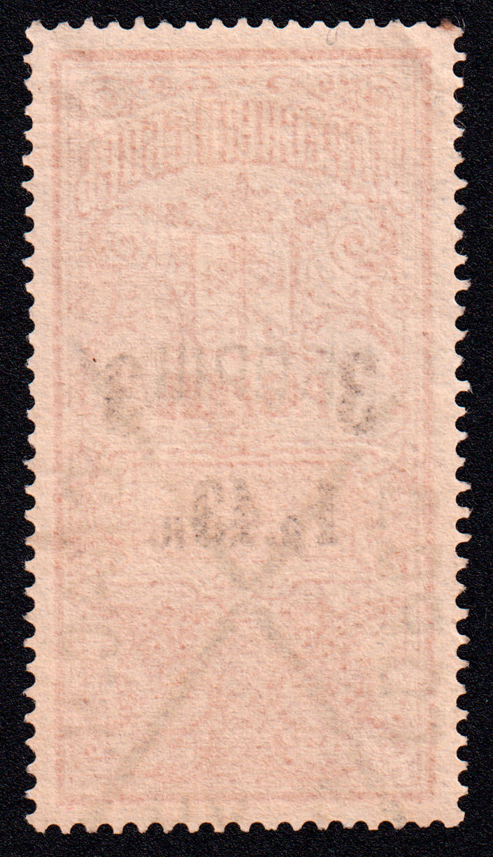 Марка учетного назначения, использована в качестве почтовой. Печать: типографская. Гильошированный фон. Wm 7. Перфорация гребенчатая 13.