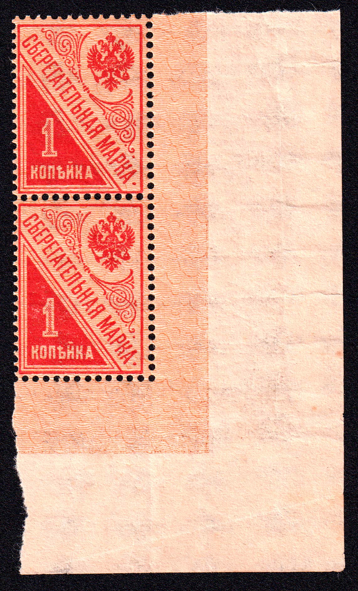 Марки учетного назначения, использованы в качестве почтовой. Печать: типографская. Гильошированный фон. Wm 7b — вертикальный ромб. Перфорация гребенчатая 13.