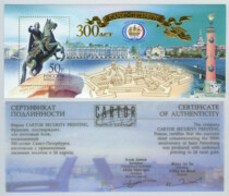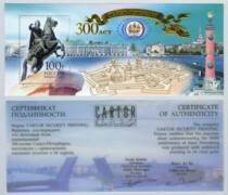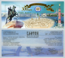 Фирма Cartor Security Printing, Франция, подтверждает, что почтовый блок, посвященный 300-летию Санкт-Петербурга, изготовлен с применением тиснения золотом в 24 карата.