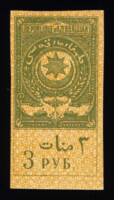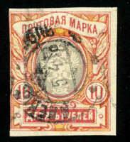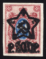 Кат. № 138. Надпечатка типографская черной краской нового номинала на марке 99. Печать: типографская. Перфорация: рамочная 14 1/4 : 14 3/4.