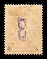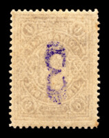 Кат. № 20. Печать литографская. Бумага белая. Перфорация линейная 11 1/2. Надпечатка ручным фиолетовым штемпелем нового номинала на марках предыдущих выпусков.