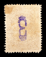 Кат. № 23. Печать типографская. Бумага белая. Перфорация линейная 13 1/4. Изг. ЭЗГБ. Надпечатка ручным фиолетовым штемпелем нового номинала на марках предыдущих выпусков.