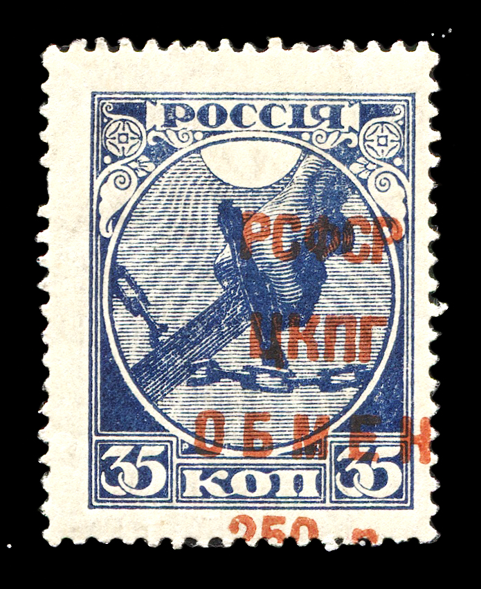 Кат. № SI13Tb. Сдвиг надпечатки. Надпечатка типографская красной краской текста “РСФСР ЦКПГ – обмен” и нового номинала на марке 1. Тираж – 250 000. Перфорация гребенчатая 13 1/2.