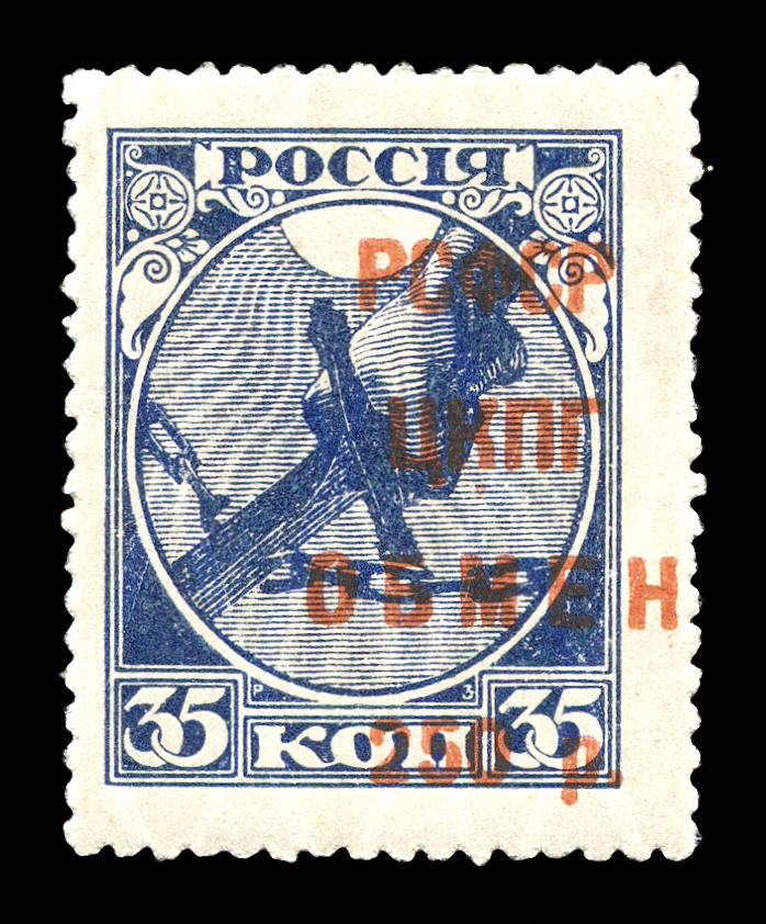 Кат. № SI13. Надпечатка типографская красной краской текста “РСФСР ЦКПГ – обмен” и нового номинала на марке 1. Тираж – 250 000. Перфорация гребенчатая 13 1/2.