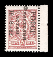 Кат. № 84. Надпечатка литографская черного цвета пятиконечной звезды с серпом и молотом и нового номинала на марке 146 (1917 г. ). Без перфорации. Тираж – 24 800 000.
