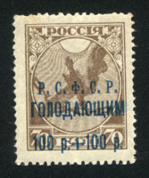 Кат. № 22Tg. Частичный абкляч. Надпечатка типографская синяя текста "Р.С.Ф.С.Р. ГОЛОДАЮЩИМ" и нового номинала на марке 2. Тираж – 1 500 000.