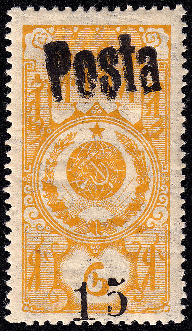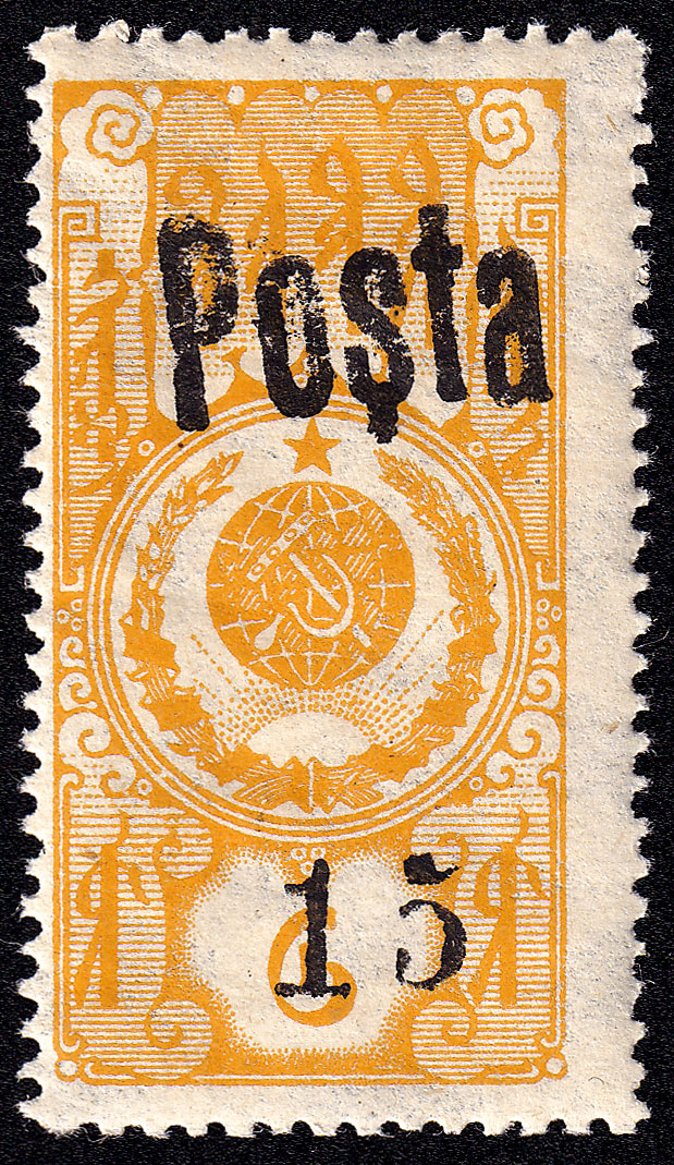 Гербовая марка с ручными черными надпечатками слова "Posta" и нового номинала металлическим нумератором. Высота цифр 5,1 мм. Новодел.