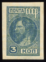 Кат. № 338. Клей восстановленный. Тираж – 750 000. Цвет: темно-зеленая. Печать: глубокая. Водяной знак – Wm 11b. Перфорация гребенчатая 12 : 12 1/4.