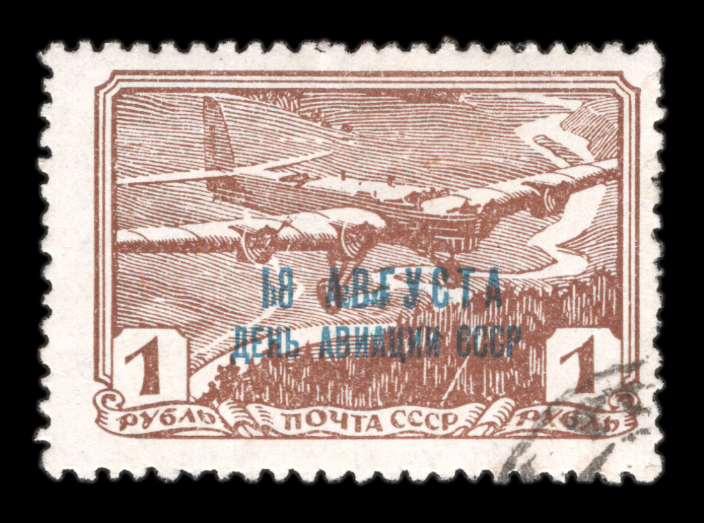 Кат. № 605. Надпечатка синяя типографская текста "18 августа день авиации СССР" на марке 546 в измененном цвете. Тираж – 200 000. Цвет: коричневая. Печать: типографская.