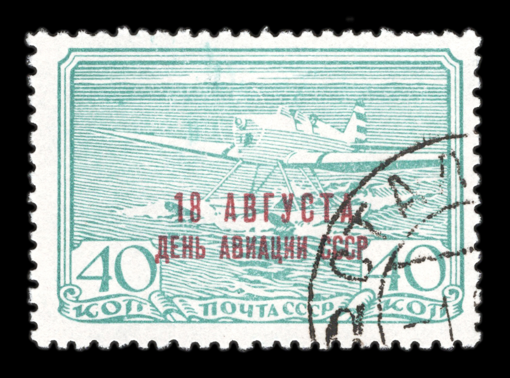 Кат. № 603. Надпечатка вишневая типографская текста "18 августа день авиации СССР" на марке 543 в измененном цвете. Тираж – 400 000. Цвет: зеленая. Печать: типографская.