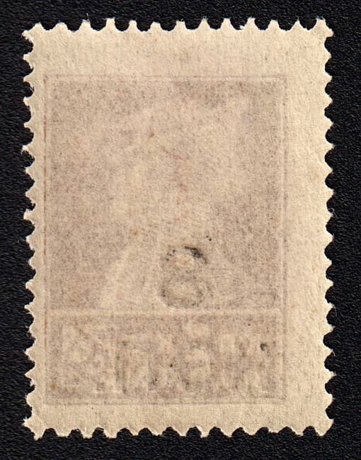 Кат. № 181 A. Надпечатка типографская черная "8 коп. " на марке 45 A. 8 к. /7 к. Расстояние между строчками надпечатки 2 мм. Цвет: коричневая. oWmk – без водяного знака. Перфорация рамочная. 12 : 12 1/4