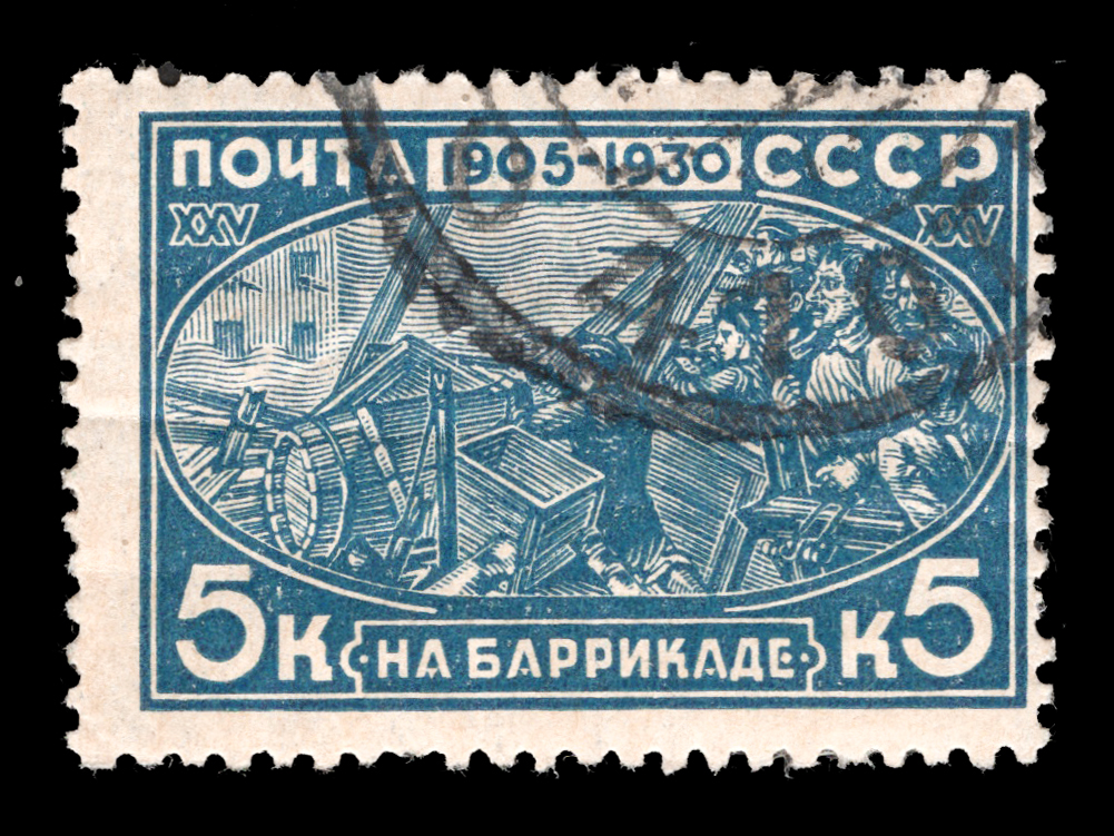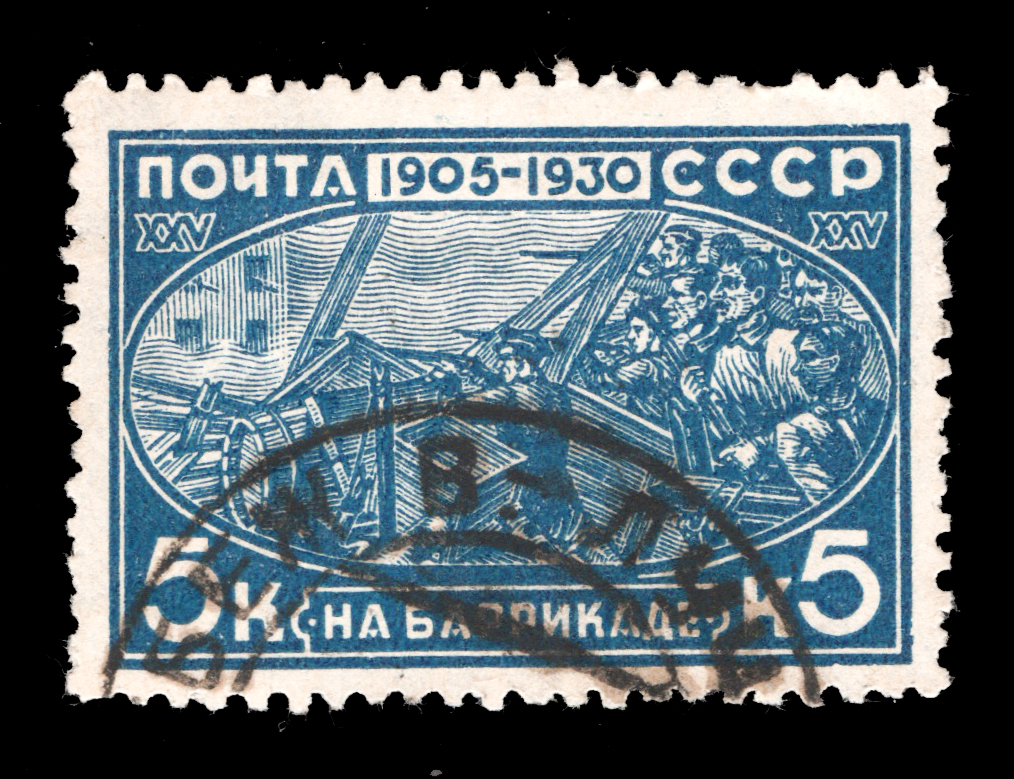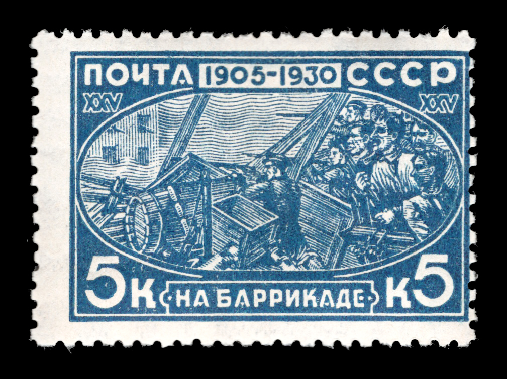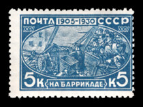 2) Рабочие на баррикадах. 5 к. Кат. № 261. Тираж – 750 000. Цвет: синяя. Печать: типографская. Водяной знак – Wm 11a. Без перфорации.