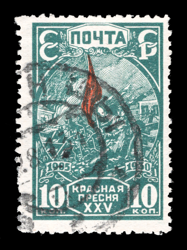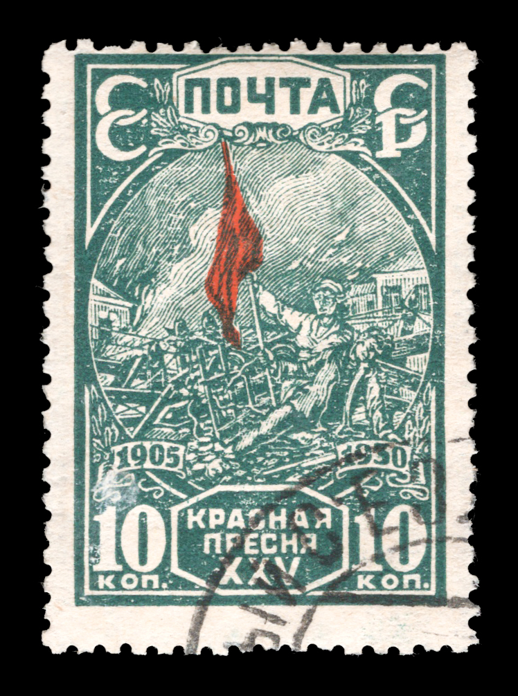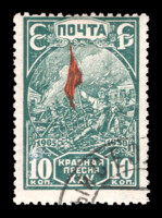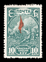 3) Красное знамя на баррикадах. 10 к. Кат. № 262. Тираж – 500 000. Цвет: темно-зеленая, красная. Печать: типографская. Водяной знак – Wm 11b. Без перфорации.