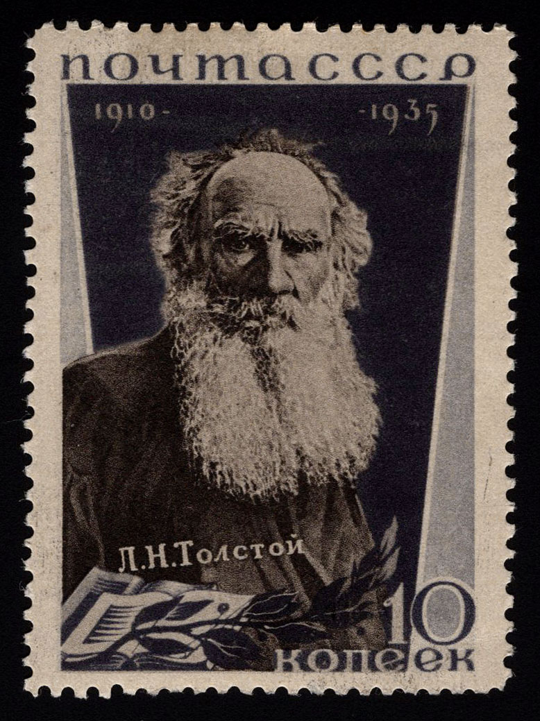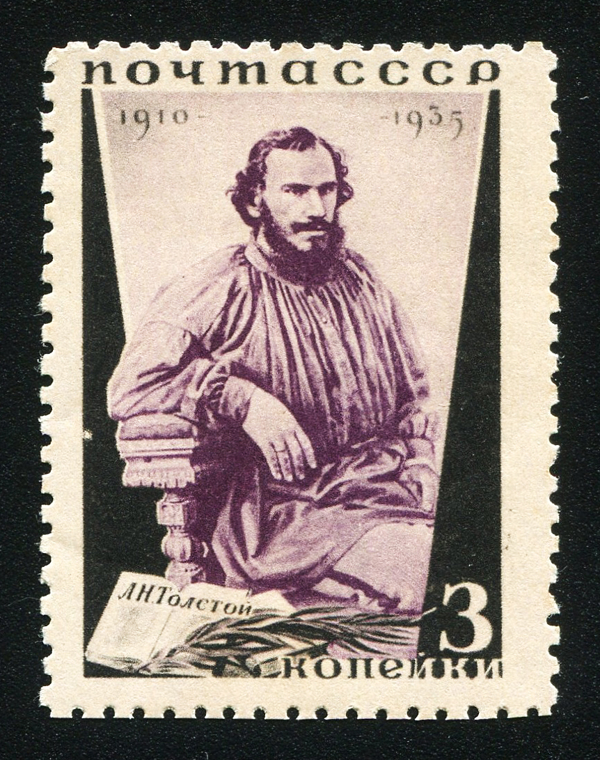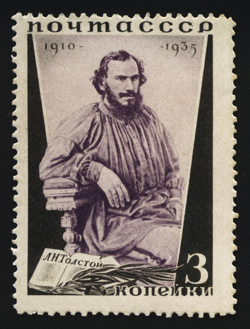 1) Портрет Л. Н. Толстого. 3 к. Кат. № 429A. Цвет: лиловая, черная. Печать: фототипия. oWm – без водяного знака. Перфорация линейная 11.
