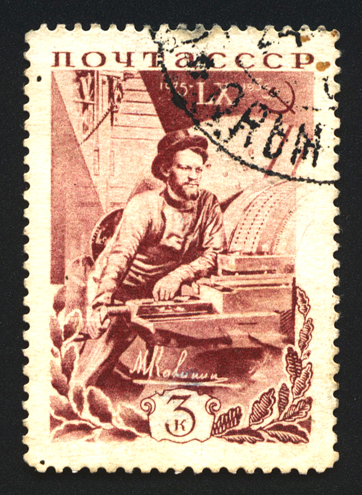 1) М. И. Калинин у токарного станка. 3 к, Кат. № 425. Тираж – 100 000. Цвет: лиловая. Печать: фототипия. oWm – без водяного знака. Перфорация линейная 13 3/4. Бумага: белая и тонированная.