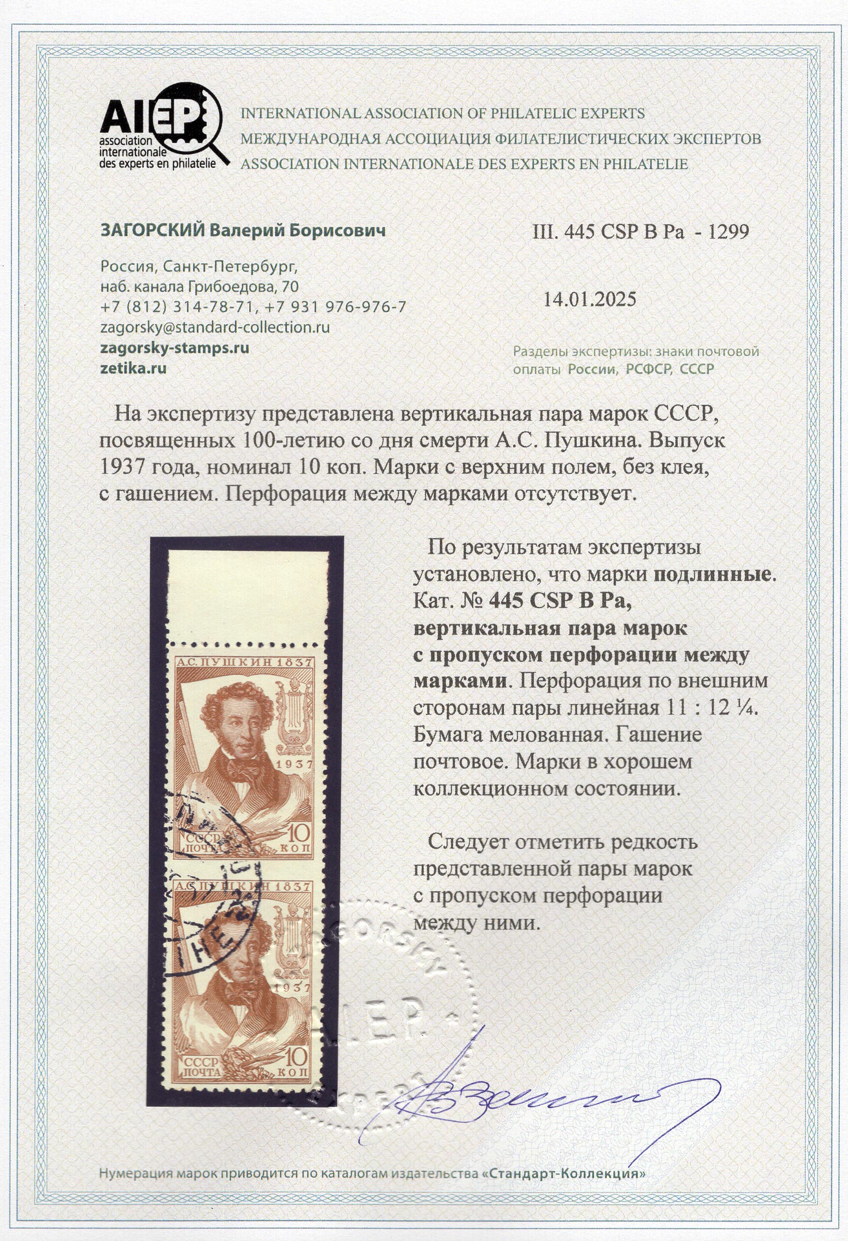 Кат. № 445 CSP B Pa. Вертикальная пара с пропуском перфорации между марками. Без клея.