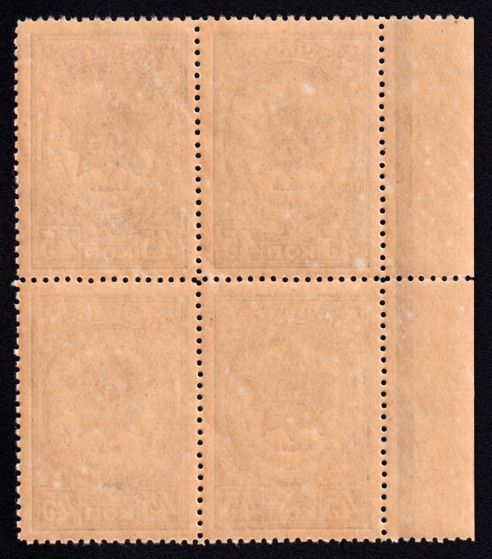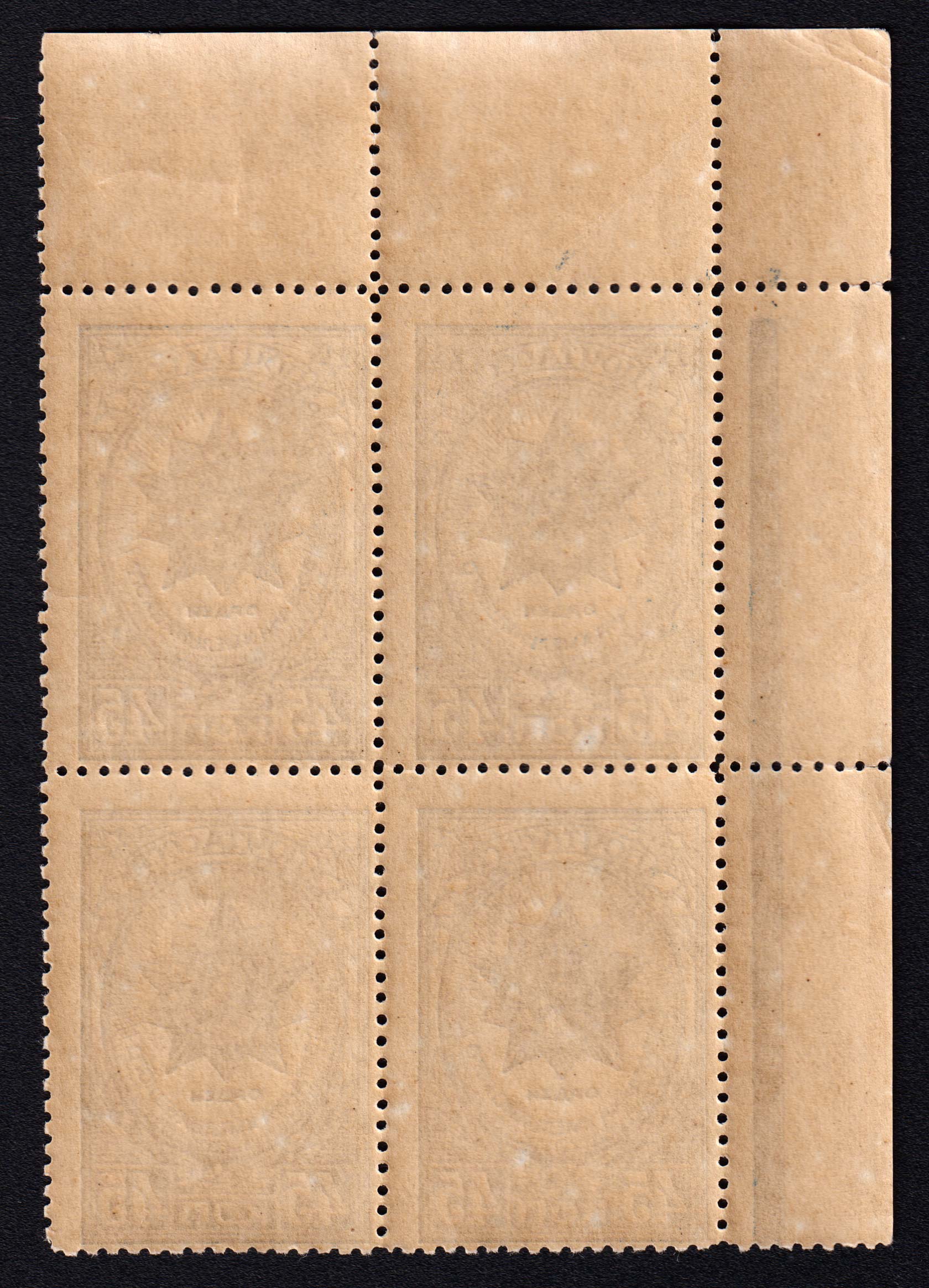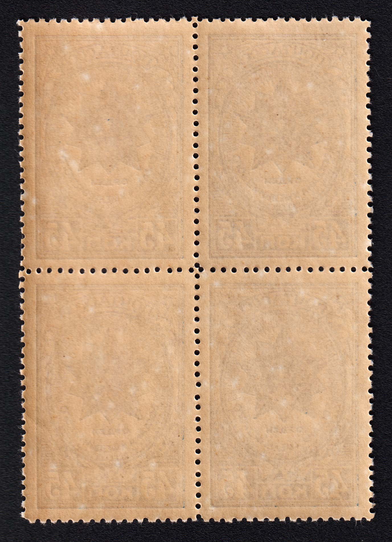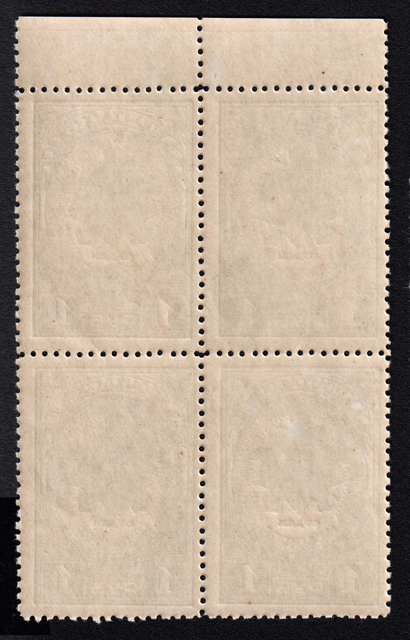 Кат. № 872. Квартблок: 4 марки. Цвет: серо-коричневая, красная. Печать: фототипия. Перфорация линейная 12 1/4. Разновидность: сдвиг красного цвета.