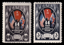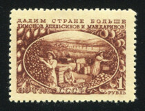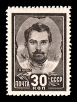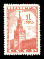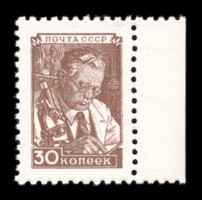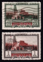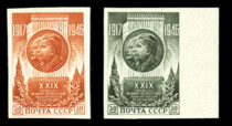 1) Барельефное изображение В.И. Ленина и И.В. Сталина. 30 к. Кат. № 1002. Цвет: кирпично-красная. Печать: глубокая. Растр ГР (горизонтальный ромб).