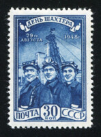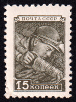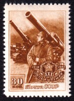 1) Танкисты на занятиях. 30 к. Кат. № 1224. Тираж – 350 000. Цвет: коричнево-черная. Печать: глубокая. Растр ВР (вертикальный ромб). Перфорация линейная 12 1/2.