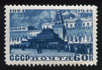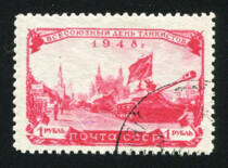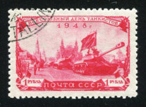 2) Танковая колонна на параде на Красной площади. 1 р. Кат. № 1225. Тираж – 700 000. Цвет: карминовая. Печать: глубокая. Растр ВР (вертикальный ромб). Перфорация линейная 12 1/2.