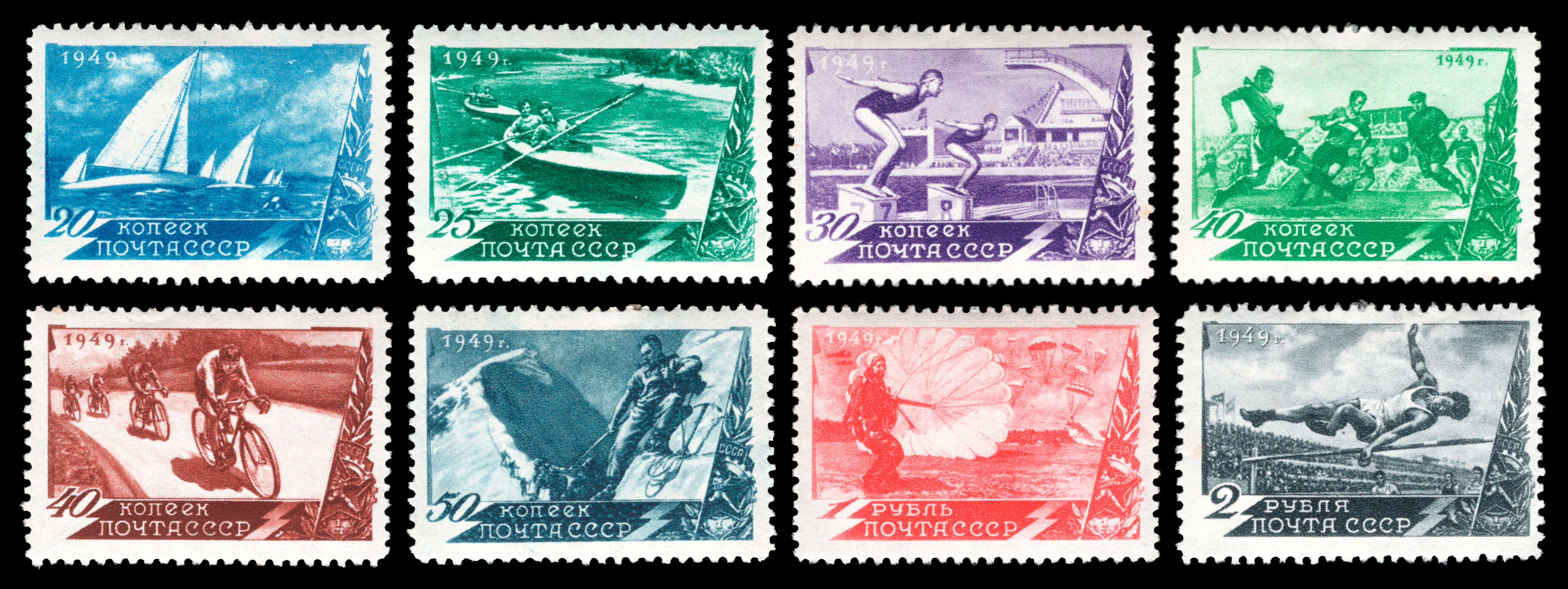 8) Легкая атлетика. 2 р. Кат. № 1325(1). Тираж – 500 000. Цвет: темно-серая. Печать: глубокая. Растр КВ (квадрат). Перфорация линейная 12 1/4.