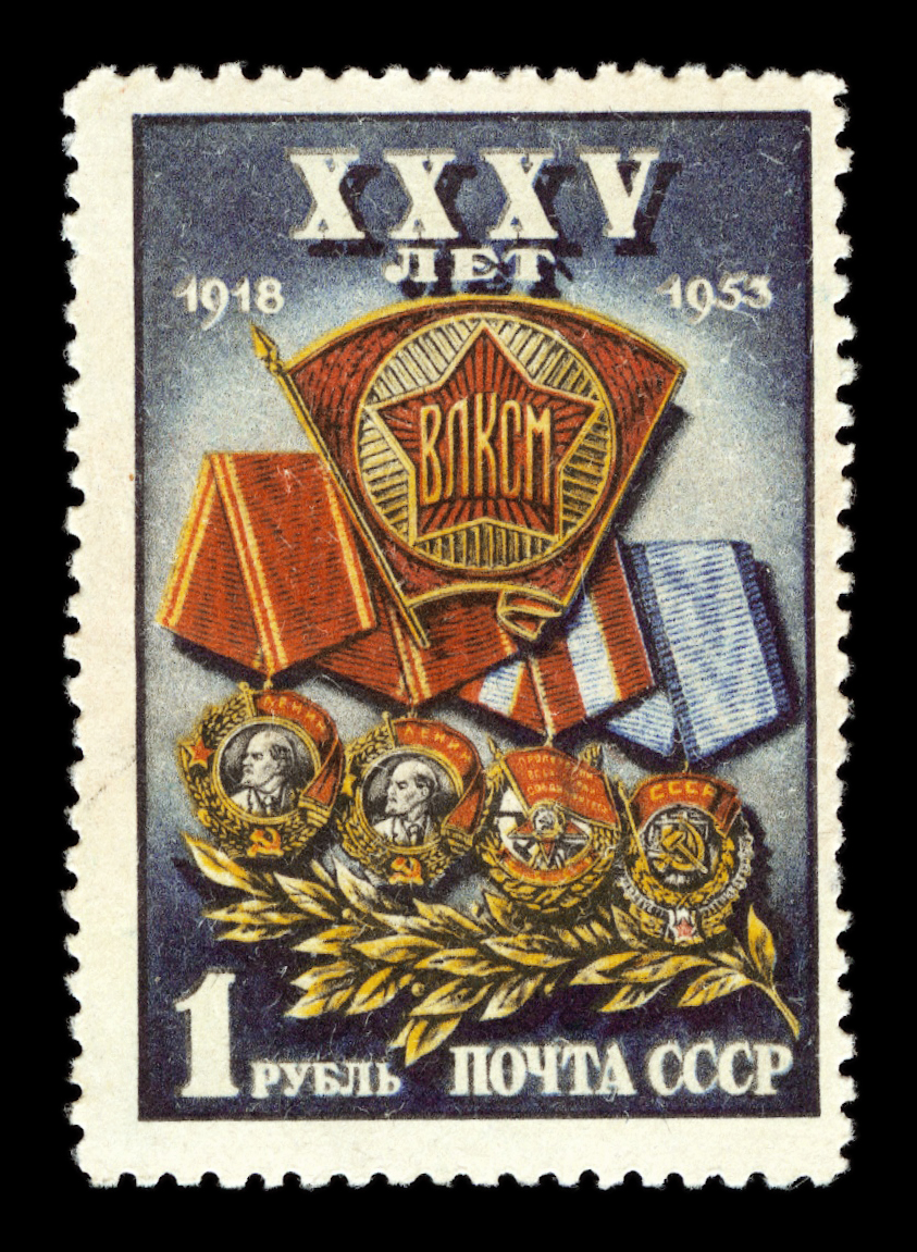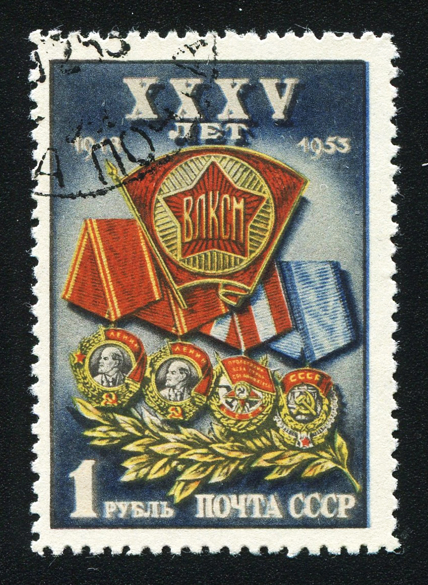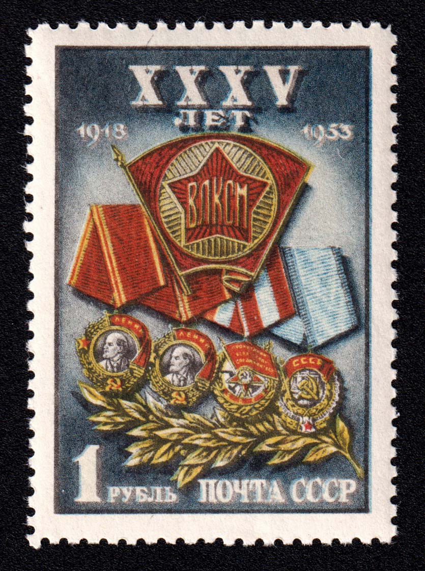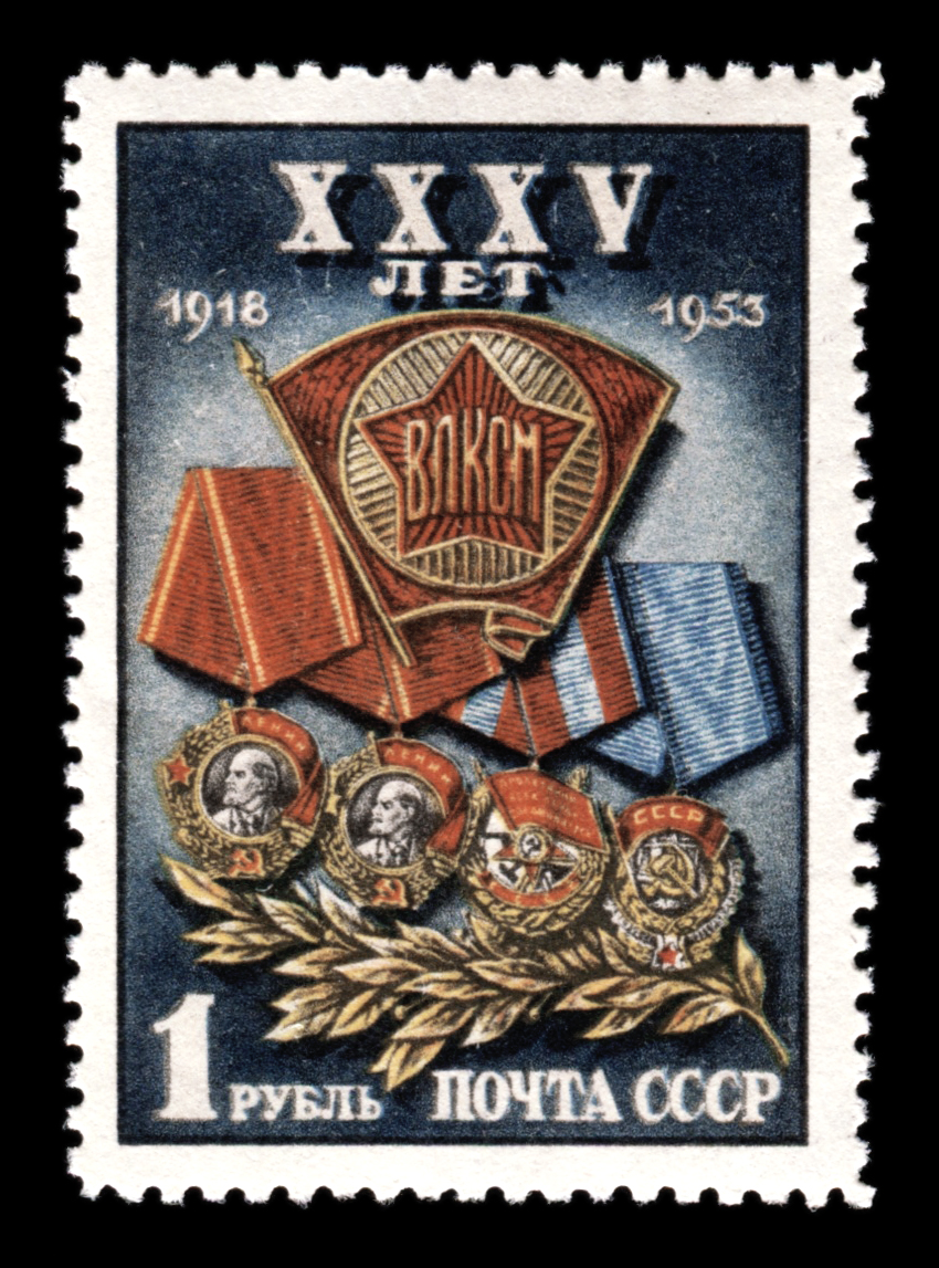 2) Значок ВЛКСМ на фоне орденов – наград комсомола. 1 р. Кат. № 1643. Тираж – 10000 000. Цвет: многоцветная. Печать: фототипия. Перфорация линейная 12 1/4.