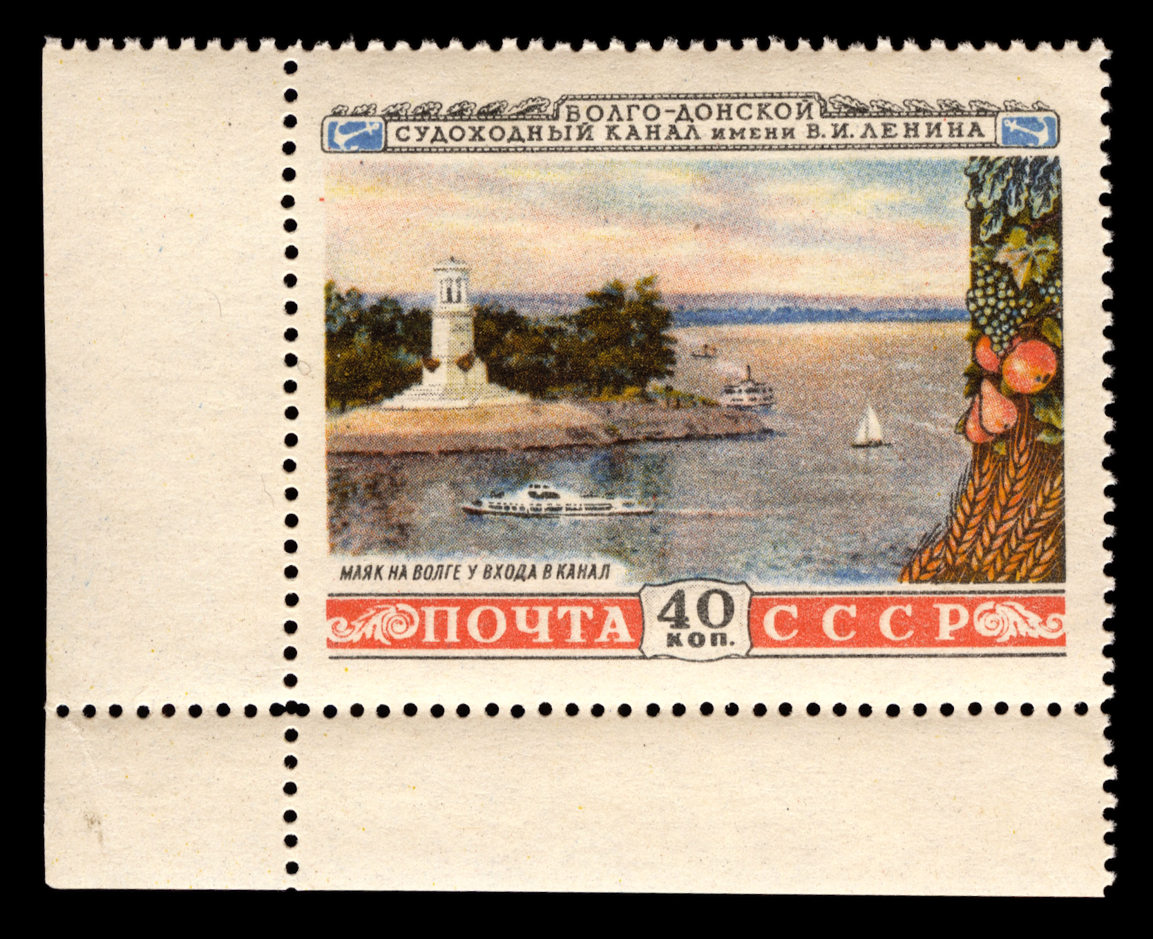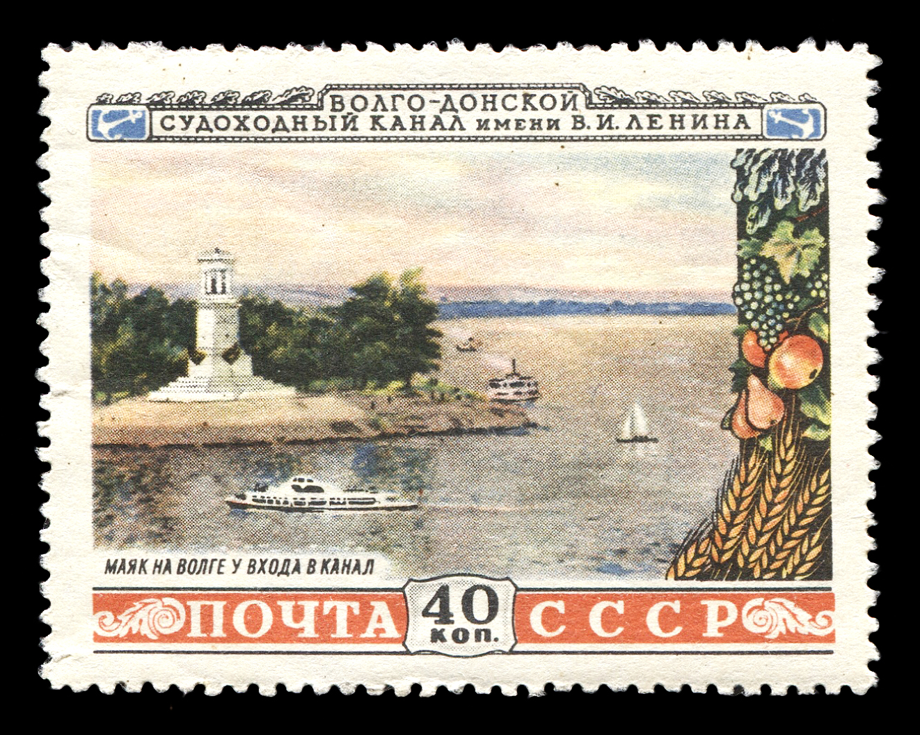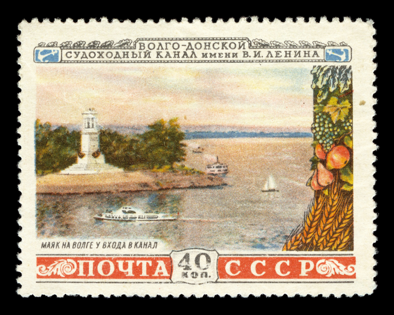 5) Маяк на Волге у входа в канал. 40 к. Кат. № 1638. Тираж – 2000 000. Цвет: многоцветная. Печать: офсет. Перфорация линейная 12 1/4.