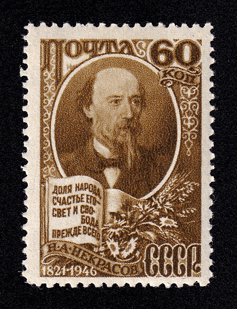 1) Портрет Н.А. Некрасова. 30 к. Кат. № 1006. Тираж – 5000 000. Цвет: серая. Печать: глубокая. Перфорация линейная 12 1/2.