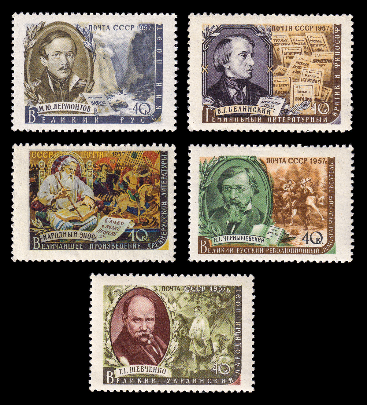 1) М.Ю. Лермонтов (1814-1841). 40 к. Кат. № 1882. Цвет: темно-коричневая, серо-синяя. Печать: офсет.