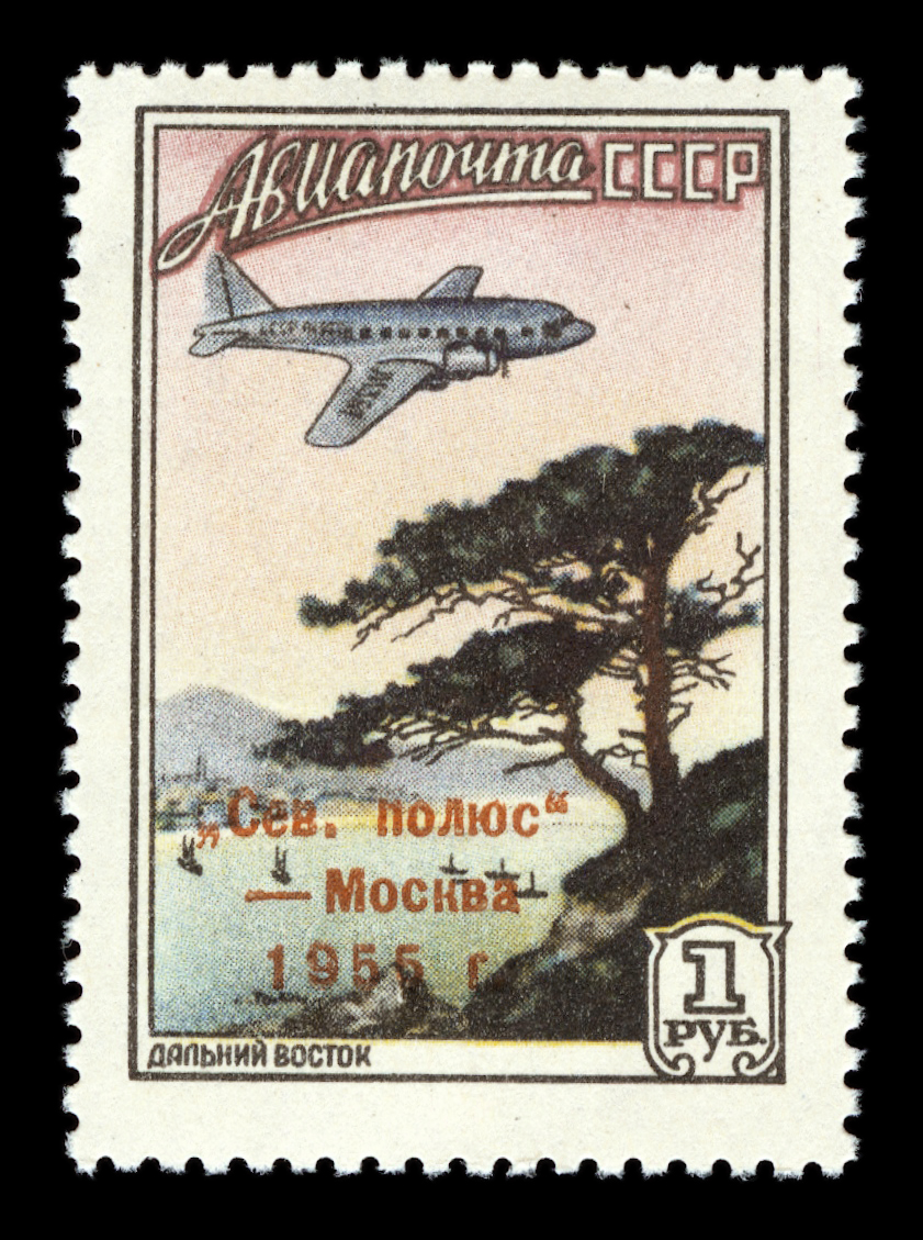 1) Надпечатка типографская карминовая «Сев. полюс» — Москва 1955 г.» на марке 1726. Кат. № 1755. Цвет: многоцветная.