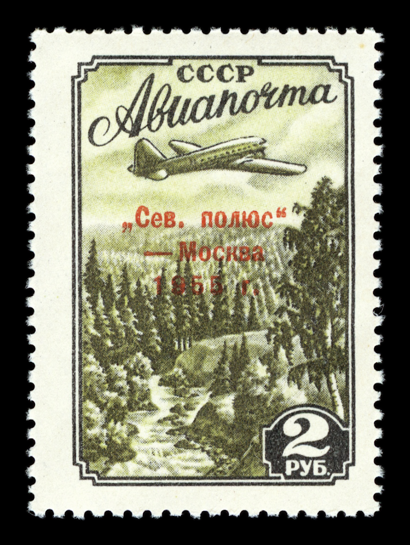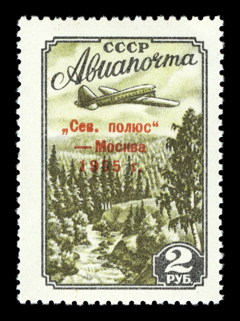 2) Надпечатка типографская красная «Сев. полюс» — Москва 1955 г.» на марке 1714. Кат. № 1756. Цвет: зеленая, серо-зеленая. Тираж – 125 000. Печать: офсет. Перфорация гребенчатая 12 : 12 1/4.