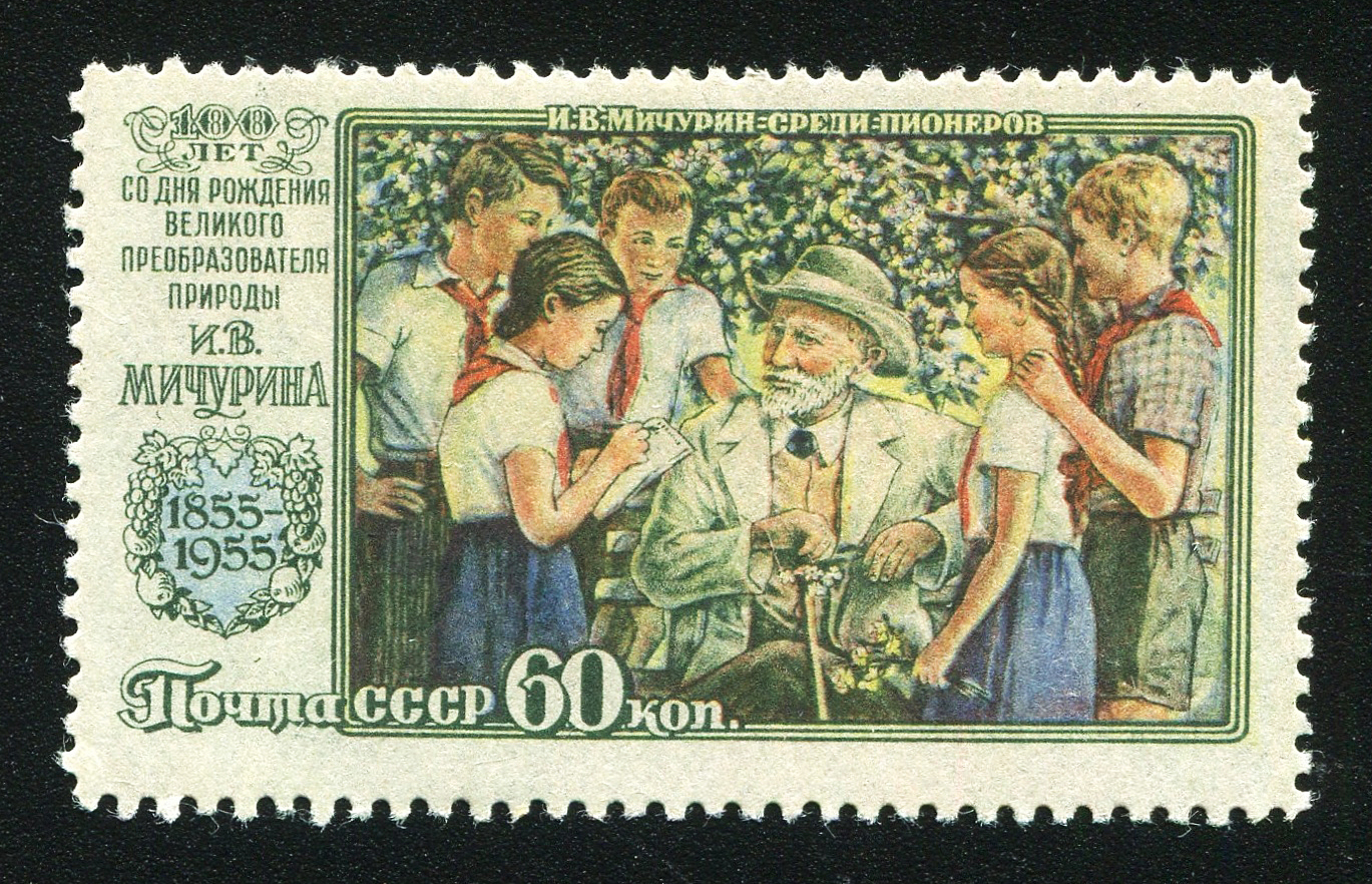 2) И.В. Мичурин среди пионеров-юннатов. 60 к. Кат. № 1806. Тираж – 1 000 000. Цвет: многоцветная. Печать: фототипия. Перфорация линейная 12 1/2.
