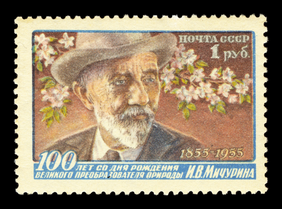 1) Портрет И.В. Мичурина. 25 к. Кат. № 1805. Тираж – 1 000 000. Цвет: многоцветная. Печать: офсет. Перфорация гребенчатая 12 : 12 1/2.